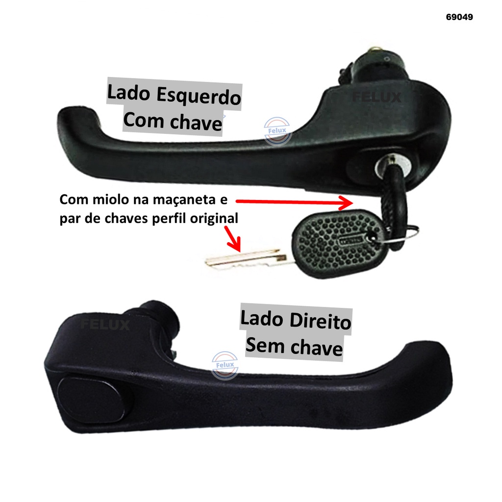 Produto: Par Maçanetas Externa com chaveCor: PretaMaterial: NylonCaracterística: Par de maçanetas, lado esquerdo com chave Cilindro Miolo padrão perfil da lâmina original e Lado direito sem chaves padrão liso.Lado de Aplicação: Esquerdo (motorista) e Direito (passageiro) Outras Características: Par de chaves com capa preta fina (padrão original) - Chave Padrão 1995 até 2003Aplicação Principal: Fiorino QuadradaModelo: Serve apenas no modelo 2 PortasMontadora: FiatAno de aplicação: 1995-2013Ano de aplicação corrida: 1995 1996Outras Aplicações: Exclusivo para a Fiorino da Familia Fiat Uno Quadrado. Pode ser aplicado em ambos os lados, direito ou esquerdo.Código FELUX: 6904905Código Original: 50005942/05 - 50007007/51Nomenclatura Equivalente: Maçaneta com Chave. Puxador, Alça e gatilhoAtenção: Procure sempre um profissional especializado para a instalação da sua peça, assim você não corre o risco de perder a garantia por mau uso.Felux Autopeças - Mais de 20 anos de experiência no ramo automotivo.Você está procurando algum produto específico e não localizou? Entre em contato conosco! Agradecemos a visita em nosso anúncio!