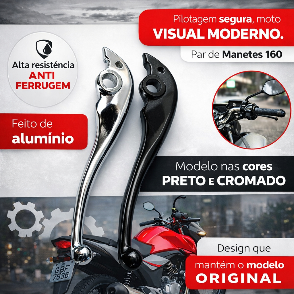 PAR DE MANETES FREIO A DISCO + EMBREAGEM – CROMADO OU PRETO Dê mais estilo, conforto e performance à sua motocicleta com este par de manetes para freio a disco e embreagem. Produzidos em alumínio forjado de alta resistência, oferecem excelente empunhadura, acabamento premium e encaixe perfeito, seguindo os padrões originais — sem necessidade de adaptações. ✅ BENEFÍCIOS Fabricados conforme medidas e padrões originais Instalação rápida e precisa, sem ajustes Alta resistência à oxidação e ao desgaste Durabilidade e longa vida útil Acabamento profissional nas cores cromado ou preto Produto com qualidade e procedência garantidas 🏍️ APLICAÇÃO CG Fan 125 / 150 / 160 – versões 2025/... CG Titan 125 / 150 / 160 – versões 2025/... CG Start 160 – versões 2025/... 🛠️ MATERIAL Alumínio forjado de alta resistência Acabamento: cromado ou preto (conforme escolha) 📦 CONTEÚDO DA EMBALAGEM 1x Manete de Freio a Disco 1x Manete de Embreagem (cor conforme variação selecionada) ⚠️ ATENÇÃO Antes de efetuar a compra, verifique a compatibilidade com sua motocicleta Não realizamos trocas ou devoluções por uso incorreto, compra errada ou adaptações
