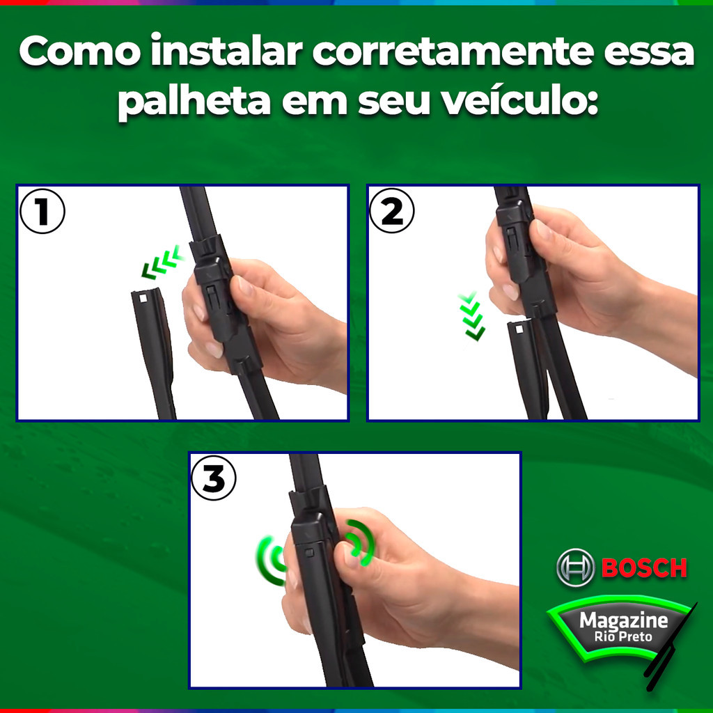 Par de palhetas para o limpador de para-brisa dianteiro Chevrolet Prisma 2013 até 2018 - Original Bosch Par de Palheta Aerofit Bosch: 01 - Palheta Aerofit Bosch (lado motorista) 24 '' 01 - Palheta Aerofit Bosch (lado passageiro) 14 " APLICAÇÃO: - GM CHEVROLET PRISMA 2013 - GM CHEVROLET PRISMA 2014 - GM CHEVROLET PRISMA 2015 - GM CHEVROLET PRISMA 2016 - GM CHEVROLET PRISMA 2017 - GM CHEVROLET PRISMA 2018 ENCAIXE: CLIP ** PRODUTO A PRONTA ENTREGA ** OBS: As informações contidas no verso da embalagem são apenas sugestões de uso porém o produto é compatível com o veículo de ano e modelo anunciado acima. Podem haver pequenas variações em relação ao tamanho para maior ou menor em relação as palhetas originais do veículo mas não interferem em seu uso e eficiência, o uso deste produto é indicado pela montadora do veículo e pela fabricante do produto. *Em caso de dúvidas para a instalação, consulte o vídeo disponibilizado no anúncio do produto ou entre em contato conosco para que possamos disponibilizar o material explicativo de como seguir com a aplicação em seu veículo. Substitua as palhetas do seu veículo pelo menos uma vez por ano. Se a palheta for nova e o defeito persistir, verifique também a regulagem dos braços do limpador de para-brisa. Bosch é o único fabricante de palhetas que desenvolveu um processo inovador de revestimento da borracha, o Power Protection Plus, um tratamento interno da borracha, que garante funcionamento suave, perfeita ação de limpeza e maior vida útil. As demais palhetas existentes no mercado possuem tratamento superficial da borracha, o que acaba prejudicando sua durabilidade e eficácia com o uso contínuo. As palhetas do limpador de para-brisas da Bosch são compostas por componentes com qualidade certificada, o que assegura uma limpeza ideal. Características: - Nova geração de palheta Bosch aerodinâmica, substitui a palheta convencional nos veículos. - Desenho aerodinâmico – mantém a pressão uniforme em todo o para-brisa. - Longa vida útil, sem partes metálicas expostas, mantendo a funcionalidade e estética visual do produto. - Tratamento de grafite, garantia de uma limpeza mais suave. - Funcionamento suave. - Perfeita ação de limpeza. - Maior vida útil. - A melhor visibilidade e o enorme nível. - Alta qualidade e tecnologia de ponta. As palhetas perdem propriedades de limpeza pela constante exposição às mudanças de temperatura, sol, chuva, além de substâncias corrosivas do ambiente. Por isso precisam ser substituídas regularmente, para garantir boa visibilidade e segurança ao motorista. Substitua as palhetas ao observar: - Problemas no para-brisa: - Formação de faixas e riscos - Ruído ou trepidação - Formação de névoa - Falhas na limpeza - Problemas nas palhetas: - Lâmina quebradiça - Lâmina torta - Lâmina rompida