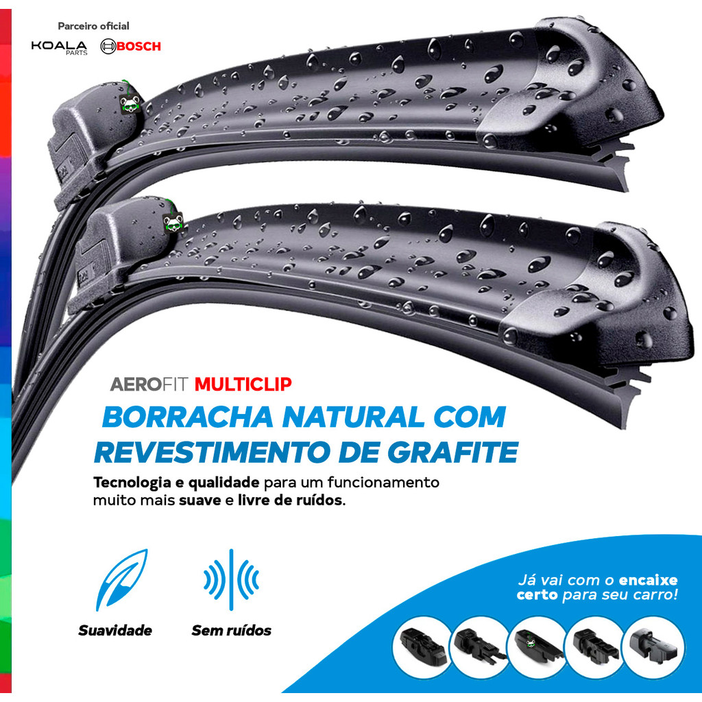 Par Palheta Limpador Parabrisa Aerofit Multiclip Bosch Polo 2010 2011 2012 2013 2014 PRATICIDADE EM AÇÃO! Já enviamos a palheta com o encaixe perfeito para o seu carro. A Palheta Aerofit Multiclip entrega uma limpeza uniforme, silenciosa e de alta performance, mesmo sob chuva intensa. Com borracha natural e revestimento em grafite, o deslizamento é suave e sem ruídos. Seu design inteligente com 3 a 5 adaptadores por palheta amplia a compatibilidade com os principais modelos do mercado, incluindo o tradicional braço gancho. Aplicação: Volkswagen Polo - 2010 a 2014 - Suavidade - Sem ruídos - Não risca o vidro - Melhor contato com o para-brisas - Encaixe preciso com adaptadores - Resistência ao desgaste BORRACHA NATURAL COM REVESTIMENTO DE GRAFITE Deslizamento suave, livre de ruídos e riscos. SPOILER AERODINÂMICO Garante aderência em alta velocidade. DESIGN FLAT + ADAPTADORES MULTICLIP Cobertura de frota ampliada com encaixe perfeito. ALTA RESISTÊNCIA E DURABILIDADE Mais vida útil, menos desgaste. INSTALAÇÃO RÁPIDA E SIMPLES Com até 5 adaptadores inclusos (G, 2, 3, 4 e 5). Líder global em autopeças, a Bosch desenvolveu a linha Aerofit Multiclip para unir versatilidade e desempenho. A palheta entrega o máximo em eficiência, durabilidade e cobertura de frota — com a garantia de qualidade que só a Bosch oferece. Cuidados e Manutenção: Com o tempo, a exposição ao sol, chuva e poluição causa o desgaste das palhetas. A substituição regular é essencial para manter a visibilidade e a segurança ao dirigir. - Substituição recomendada: a cada 12 meses. - Manutenção: limpar as lâminas com pano úmido e evitar produtos químicos agressivos. Enviamos bem embalado, super rápido e com garantia de originalidade. Garanta o seu e confira os outros produtos da nossa Loja Koala Parts. Especificações técnicas: Modelos: AF21M (motorista) + AF19M (passageiro) Tamanho: 530 mm (21") + 475 mm (19") Tipo: Aerodinâmica / Emborrachada Material: Borracha natural com revestimento em grafite Estrutura: Com spoiler aerodinâmico integrado Adaptadores inclusos: Até 5 adaptadores (G, 2, 3, 4 e 5) Durabilidade: Recomendado trocar a cada 12 meses Aplicação: Substitui palhetas convencionais Conteúdo da Embalagem: 1 Palheta Aerofit Multiclip 21" 1 Palheta Aerofit Multiclip 19"