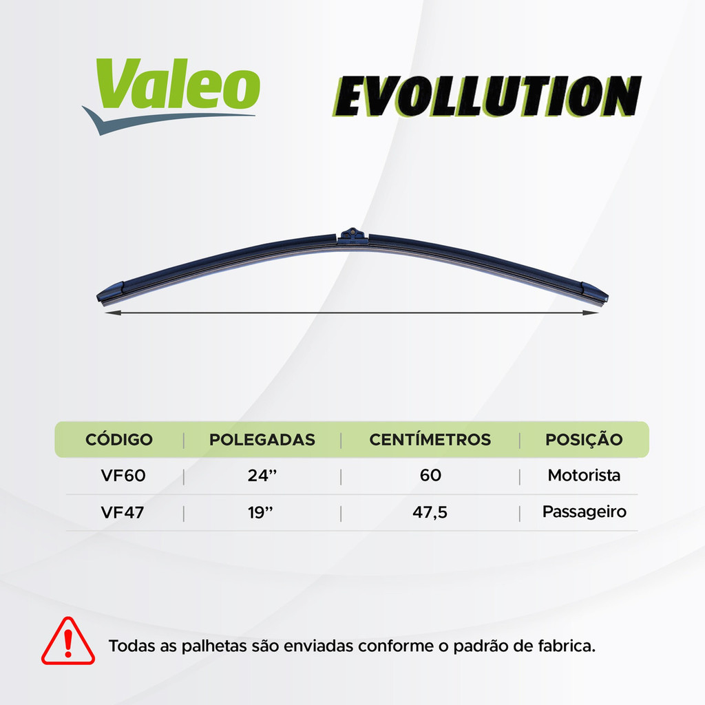 Par de Palhetas Limpador de Parabrisa Originais VALEO Evollution Adaptador Específico Flat Blade Qualidade, segurança, visibilidade e a mais alta tecnologia em palhetas. Só a VALEO tem. Sistema de Conexão: Adaptador Específico Kit composto por: - 1 Palheta Evollution Flat Blade lado Esquerdo Original Valeo - 1 Palheta Evollution Flat Blade lado Direito Original Valeo Medidas: - Palheta Motorista: 24" = 60 cm - Palheta Passageiro: 19" = 47,5 cm Compatível com: - Volvo Xc90 2016 A 2024 Tecnologia Exclusiva - Fórmula TEC² - Durabilidade Aumentada - Controle de Fluxo de Ar 3D – Limpeza Otimizada - Encaixe Adaptador Específico - Simples, rápido e prático! - Design Inovador – Projetada para oferecer máxima qualidade de limpeza - Aderência ao Para-brisas – O design da palheta permite que o fluxo de ar dê mais aderência, evitando ruídos e trepidações. Borracha com altíssimo padrão de QUALIDADE e DURABILIDADE. Limpadores de para-brisas com design aerodinâmico, performance superior e fácil instalação. VALEO ORIGINAL: Nas principais montadoras do país! A maior cobertura de frota. A Valeo, líder de mercado para sistemas de visibilidade, desenvolveu as palhetas das linhas Evollution e Evollution Extra com tecnologias exclusivas e patenteadas que elevam ainda mais o desempenho das palhetas do tipo flat blade. As inovações da marca garantem uma limpeza silenciosa e eficiente do vidro para-brisa em qualquer situação, inclusive em alta velocidade. Outro diferencial é a facilidade de instalação: graças ao design exclusivo, à distribuição de pressão sobre o para-brisa e aos conectores que acompanham o produto, as palhetas flat blade da Valeo são compatíveis com automóveis de qualquer montadora e ficam perfeitamente encaixadas em todos os modelos de carro. Com a nossa tecnologia, você instala as palhetas Evollution de forma simples e rápida! Tecnologia Pyramid: Efeito Aerodinâmico O formato das palhetas flat blade da Valeo é exclusivo e foi desenvolvido para oferecer a melhor performance de limpeza do para-brisa, mesmo em condições climáticas adversas ou em altas velocidades. A lâmina das palhetas Evollution conta com a tecnologia Pyramid, patenteada pela Valeo. Esse formato específico gera um efeito aerodinâmico, que controla o fluxo de ar para que favoreça o desempenho do limpador de para-brisa durante o uso. Por conta disso, a palheta consegue realizar uma limpeza melhor, evitando ruídos e trepidações. Tecnologia Flat Blade Pyramid: mais segurança, durabilidade e eficiência! Distribuição Uniforme de Pressão O desenvolvimento tecnológico da Valeo para a linha de palhetas automotivas Evollution vai além do design. Os limpadores da marca foram projetados para oferecer uma distribuição uniforme da pressão exercida pela palheta sobre o para-brisa. Com isso, o limpador tem melhor aderência ao vidro, o que favorece o desempenho. A pressão é distribuída uniformemente em toda a extensão da palheta automotiva por meio dos mais de 1.500 pontos de contato presentes na lâmina. É uma quantidade muito superior à das palhetas convencionais, que possuem entre seis e oito pontos de articulação, que pressionam o para-brisa. Características: - Palheta Original Valeo Evollution Adaptador Específico Flat Blade - Formato aerodinâmico. - Instalação mais fácil e segura. - Maior durabilidade e eficiência comprovadas. - Maior estabilidade em todas as situações de uso. - Funcionamento ultra suave para um movimento sem ruídos ou trepidações. Perguntas Frequentes: Quando devo trocar as Palhetas do meu carro? - A troca deve ser realizada aos primeiros sinais de desgaste nas Palhetas. Isso porque o componente com desgaste tem a eficiência comprometida e atrapalha a visibilidade. Quais os sinais de desgaste da palheta? - Os sinais de uma Palheta com desgaste são: a Palheta não retira todo o excesso de água, faz barulho durante o funcionamento, risca o para-brisa do carro, lâmina de borracha torta, quebrada ou ressecada. Qual o prazo para a substituição das Palhetas? - Substitua as Palhetas pelo menos uma vez por ano. As Palhetas são originais VALEO? - Sim. Somos DISTRIBUIDORES AUTORIZADOS VALEO. Todos os produtos são originais e acompanham Nota Fiscal. Observações: - Alguns cuidados aumentam a vida útil das palhetas: 1 - Sempre que lavar o carro, passe um pano úmido (apenas água) nas lâminas de borracha. 2 - Nunca use querosene na lavagem, nem produtos químicos, pois danificam a lâmina da borracha. - Em caso dúvidas sobre o modelo correto da Palheta para o seu carro, faça uma pergunta na parte inferior do anúncio. Temos uma equipe especializada para tirar as suas dúvidas. - O limpador de parabrisa é um acessório obrigatório por lei (artigo 230, XIX, do CTB). O não funcionamento perfeito ou mau uso do mesmo, é caracterizado como infração grave, com direito a multa e retenção do veículo. Mantenha a sua família segura. Compre Palhetas Originais VALEO EVOLLUTION.