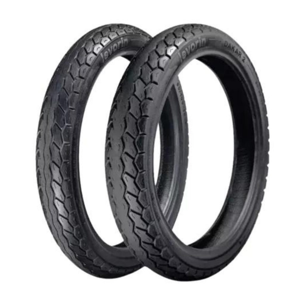 Pneu Dianteiro: 80/100-18 47P e Traseiro: 90/90-18 57P Modelo: Dakar 2 Marca: Levorin Índice de Carga: Dianteiro 47 (175kg) e Traseiro 57 (230kg) Índice de Velocidade: Dianteiro P (150km/h) e Traseiro P (150km/h) Uso: Dianteiro Sem câmara e Traseiro Sem câmara -------------------------------------------------------- Antes de finalizar a compra, confira as medidas que sua moto está utilizando atualmente! Aguardamos a sua compra! -------------------------------------------------------- * NÃO ACOMPANHA RODA -------------------------------------------------------- Garantia de 5 anos somente por defeitos de fabricação, ficando inválida em caso de danos por acidentes, buracos na pista, mau uso e ainda má instalação. É necessário e indispensável instalar o pneu com um profissional especializado.