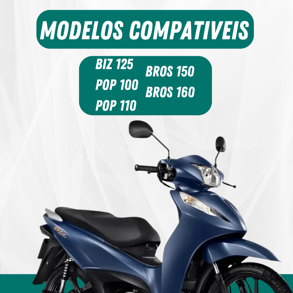 Par Retrovisor Biz 125 / Bross 09 / Pop Honda Renove o visual e aumente a segurança da sua moto com o Par de Retrovisores. Produzido com materiais de alta resistência, oferece excelente durabilidade, ótimo acabamento e visual semelhante ao modelo original Honda. Modelo com design similar ao original da Biz 125, Bross 09 e Pop, levemente mais compacto, mantendo estética fiel e encaixe perfeito. Características do Produto: • Material: Plástico ABS de alta resistência e excelente durabilidade • Haste: Aço reforçado com pintura preta, maior firmeza e resistência • Lente: Convexa, proporcionando visão clara e precisa • Compatibilidade: Uso universal, aplicável em praticamente toda a linha Honda • Produto Nacional: Fabricado no Brasil com rigoroso controle de qualidade Conteúdo da Embalagem: • 01 Par de Retrovisores (Direito + Esquerdo) Garantia • 90 dias de garantia de fábrica contra defeitos de fabricação. Ideal para reposição com excelente custo-benefício, resistência e acabamento profissional.
