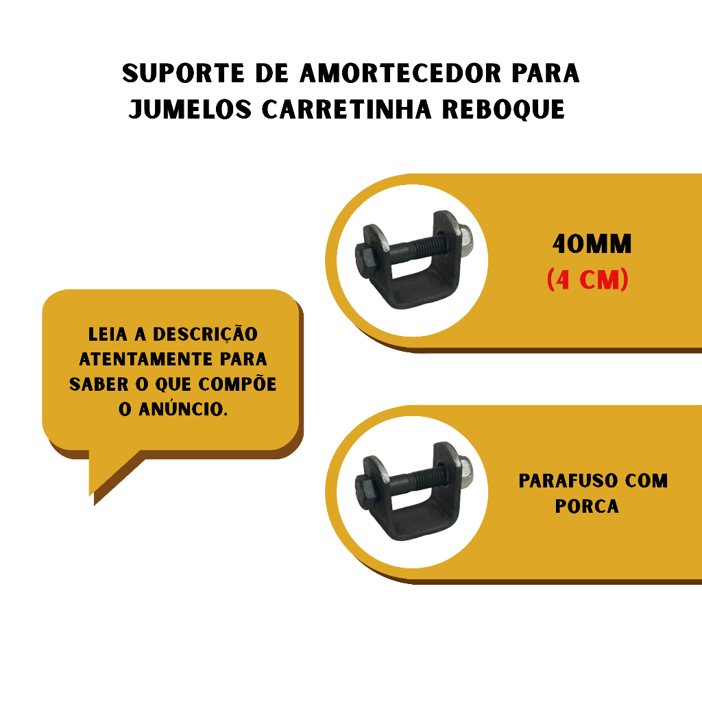Par Suporte De Amortecedor Universal Para Jumelos Carretinha Reboque Chassi Completo 2026 Transportar cargas em carretinhas e reboques com segurança e estabilidade é essencial. Suporte De Mola Amortecedor P/ Jumelo Carretinha Reboque é a solução ideal para quem busca resistência e tranquilidade. Características: Compatibilidade: Projetado para amortecedores com suporte de 40 mm (4 cm). Materiais de Qualidade: Fabricado em chapa especial e parafusos de aço reforçado, garantindo durabilidade e resistência excepcionais. Estabilidade: Oferece estabilidade superior durante o transporte, proporcionando confiança ao usuário. Conteúdo do Kit: 2 Chapas de 40 mm (Suporte de molas) 2 Parafusos com porcas Produto novo • Pronta entrega • Envio rápido Clique em *Comprar agora* e leve qualidade e segurança para o seu reboque! Pronto para instalação Peças reforçadas Enviamos para todo o Brasil Invista na segurança e na durabilidade com total tranquilidade. *(Itens adicionais são vendidos separadamente, consulte nossos outros anúncios)* - Atendimento e Suporte Nosso time está disponível para tirar dúvidas antes e depois da sua compra. Caso ocorra qualquer problema, pedimos que entre em contato conosco pelo chat da compra antes de abrir uma reclamação. Teremos o prazer em ajudar! Garantia do vendedor: 7 Dias. REBOMASTER – Compromisso com qualidade, segurança em seu projeto!