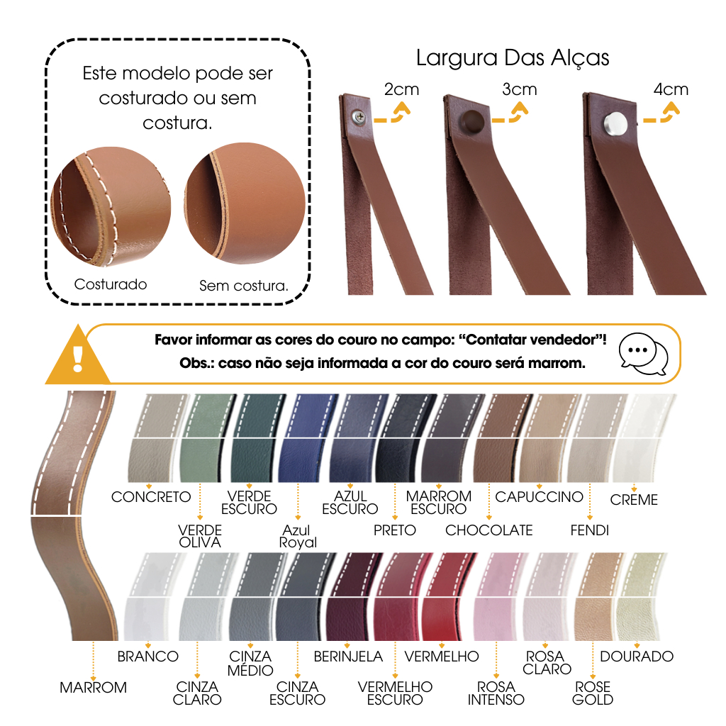 ATENÇÃO!!!!! ==> Ganhe de 10% até 70% de DESCONTO por unidade a mais, comprando no kit com a quantidade desejada! Peça já seu kit no campo "Conversar Agora"! <== ATENÇÃO!!!!! OBS.: Este anuncio NÃO ACOMPANHA A PRATELEIRA!!! Acompanha 01 par de alças na largura e comprimentos escolhidos, parafusos simples e TODOS os parafusos e buchas necessários para a instalação da prateleira. APÓS A COMPRA, nos informe a cor desejada para suas alças e, na largura de 4cm, a cor dos acabamentos metálicos. Se não for informado, será enviado o modelo e tamanho escolhido, porém com o couro na cor marrom e acabamento em cromado. Instalação de Tampas de Plástico A instalação de produtos de plástico requerem atenção especial para garantir um funcionamento perfeito e duradouro. Realize o aperto sem força excessiva! Siga as instruções do fabricante e aplique a força de forma uniforme, evitando danos e garantindo que todas as partes fiquem bem ajustadas e firmes. Lembre-se de que um aperto cuidadoso é a chave para a eficiência e segurança do seu produto. Com atenção e os cuidados necessários, você poderá aproveitar todos os benefícios da sua nova aquisição sem preocupações. Confie no processo e desfrute do resultado! Profundidade / Alças 10cm de prof. / 45cm compr. 15cm de prof. / 65cm compr. 20cm de prof. / 85cm compr. 25cm de prof. / 105cm compr. 30cm de prof. / 125cm compr. Nossas alças de 2cm, SUPORTAM ATÉ 6kg! Nossas alças de 3cm, SUPORTAM ATÉ 8kg! Nossas alças de 4cm, SUPORTAM ATÉ 10kg! ALÇA EM MATERIAL SINTÉTICO COM TEXTURA DE COURO NAS 23 CORES ABAIXO: Concreto - Verde Oliva - Verde Escuro - Azul Royal - Azul Escuro - Preto - Marrom Escuro - Marrom - Chocolate - Capuccino - Fendi - Creme - Branco - Cinza Claro - Cinza Médio - Cinza Escuro - Berinjela - Vermelho Escuro - Vermelho - Rosa Intenso - Rosa Claro - Rose Gold – Dourado As alças de prateleiras em textura de couro são mais do que simples acessórios funcionais; elas são elementos de design que elevam tanto o estilo quanto a funcionalidade de qualquer espaço. Combinando a durabilidade e a elegância da textura de couro com a praticidade das alças de prateleiras, essa combinação oferece uma solução versátil para a organização de espaços domésticos e comerciais. A fabricante dos puxadores é a Mimo.dsn, uma empresa especializada em produtos à base de couro e material sintético. Temos diversos produtos além dos puxadores, uma grande opção de variedades, tamanhos e cores, para decorar todos os ambientes do seu lar ou trabalho! Produtos lindos, com extrema qualidade, e com um preço super accessível! Dê uma olhada em nossos produtos, e economize no frete adicionando mais produtos ao carrinho! Não perca tempo, você já encontrou a melhor empresa para adquirir seus produtos de decoração, que vão deixar seu espaço muito mais bonito! Além disso, se você é arquiteto ou designer, você pode utilizar nossos diversos blocos 3D de seus produtos no SketchUp, 3DWarehouse, Promob e Catolog3D. Não deixe de usar em seus projetos! Disponíveis em uma variedade de cores e estilos, as alças de prateleiras em couro podem ser facilmente adaptadas para complementar qualquer esquema de design de interiores. Desde tons neutros e terrosos que adicionam calor e textura a espaços minimalistas até cores vibrantes que injetam personalidade e energia em ambientes mais ecléticos, há uma opção de tira para atender a todos os gostos e necessidades. Em suma, as alças de prateleiras em textura de couro oferecem uma fusão harmoniosa entre estilo e função. Ao adicionar um toque de elegância e praticidade a qualquer espaço, elas são uma escolha excepcional para aqueles que buscam aprimorar tanto a estética quanto a usabilidade de suas prateleiras. As prateleiras são uma adição versátil e funcional a qualquer casa, oferecendo espaço de armazenamento adicional e oportunidades de exibição. Aqui estão alguns lugares comuns na casa onde você pode usar prateleiras: Sala de Estar: Para exibir livros, obras de arte, fotografias, plantas, coleções de filmes ou música. Como uma alternativa elegante aos tradicionais suportes de TV, exibindo a televisão na parede. Cozinha: Para armazenar utensílios de cozinha, potes, panelas, especiarias, frascos de mantimentos e pratos decorativos. Em cima da bancada para manter itens frequentemente usados ao alcance. Quarto: Para guardar livros, roupas dobradas, acessórios, lembranças, velas ou objetos decorativos. Como uma extensão do closet, para exibir sapatos, bolsas ou acessórios. Banheiro: Para organizar produtos de higiene pessoal, toalhas, rolos de papel higiênico, plantas ou itens de decoração. Acima da pia para manter produtos de cuidados pessoais organizados e acessíveis. Escritório ou Área de Estudo: Para armazenar livros didáticos, materiais de escritório, pastas, papéis e documentos importantes. Como uma área de exibição para prêmios, diplomas, fotografias de família ou arte inspiradora. Área de Entrada: Para guardar chaves, correspondências, carteiras