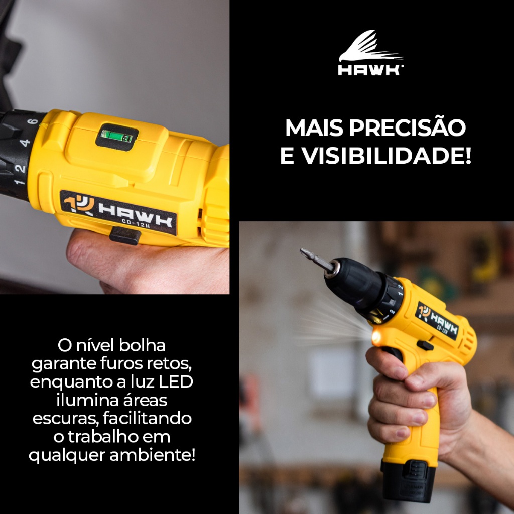 Ferramenta versátil para reparos e instalações! 🌟A praticidade que você precisa na sua maleta de ferramentas! ❗A duração da bateria varia de acordo com o uso e o nível escolhido de rotação. 🧱Tem capacidade para perfurar materiais como tijolos, blocos, madeira e drywall. ✅ Muito leve e fácil de usar ✅ Motor potente sem escovas ✅ Com sistema de reverso ✅ Carregamento em apenas 3 horas ✅ Acompanha ponteira Fenda 🌟A praticidade que você precisa na sua maleta de ferramentas!🌟 ❗A duração da bateria varia de acordo com o uso e o nível escolhido de rotação.❗ 🧱Tem capacidade para perfurar materiais como tijolos, blocos, madeira e drywall.🪵 ❌NÃO INCLUSO MALETA DE ACESSÓRIOS❌ 🌟Marca: Hawk 📍Modelo: CD-12H 🔋Bateria lítio: 12V 1.3Ah 🔩Mandril: Aperto rápido 🧲Freio elétrico 🔦LED de trabalho ⚡Torque máximo: 24Nm 🪛Mandril tamanho 10mm (3/8") ✅Garantia do vendedor: 3 meses