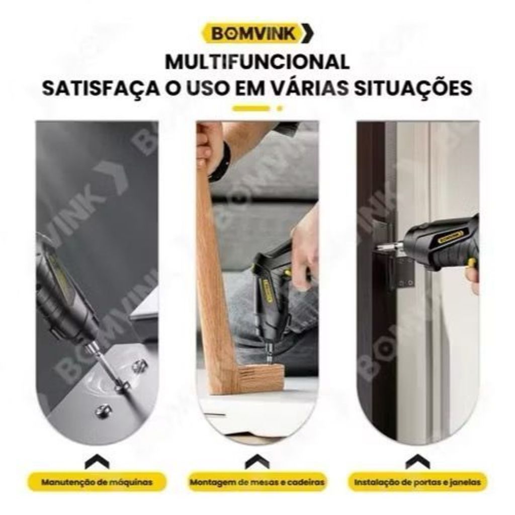 A Chave de Fenda Elétrica 12 Peças - 3.6V é a ferramenta ideal para quem busca praticidade, potência e eficiência em uma ampla variedade de tarefas. Principais Características: Uso Duplo: Tipo Reto e Tipo Pistola Versatilidade para atender às necessidades de diferentes ângulos e trabalhos. Basta pressionar o botão "PUSH" e girar o cabo para alternar entre os formatos. Torque Extra Grande Oferece maior potência para apertar e soltar parafusos com facilidade, garantindo uma operação mais suave e eficiente. Troca de Rotação com um Clique Alterna rapidamente entre as funções de montagem e desmontagem, economizando tempo e esforço. Mandril Magnético Forte magnetismo para fixação segura da broca, eliminando quedas e proporcionando maior agilidade no uso. Aplicações: Manutenção de máquinas; Montagem de mesas e cadeiras; Instalação de portas e janelas; Reparos rápidos no dia a dia. Com seu design leve, compacto e ergonômico, a Chave de Fenda Elétrica 3.6V é perfeita para trabalhos prolongados, proporcionando conforto e precisão. INFORMAÇÕES TÉCNICAS: Modelo: BOM-9913 Voltagem: 3.6v Tipo de Bateria: 1300mAH Li-Lon Interna Velocidade Sem Carga: 250RPM (Rotações por minuto) Com LED: Sim Torque: 3.5NM Entrada: Type-C DC5V (recarga da bateria) Tempo de Recarga: 2 a 3 horas Peso: 280 gramas CONTEÚDO DA EMBALAGEM: 1 Parafusadeira/Chave de Fenda Elétrica – BOM9913 10 Ponteiras 1 Alongador 1 cabo USB 1 Manual 1 Caixa/embalagem