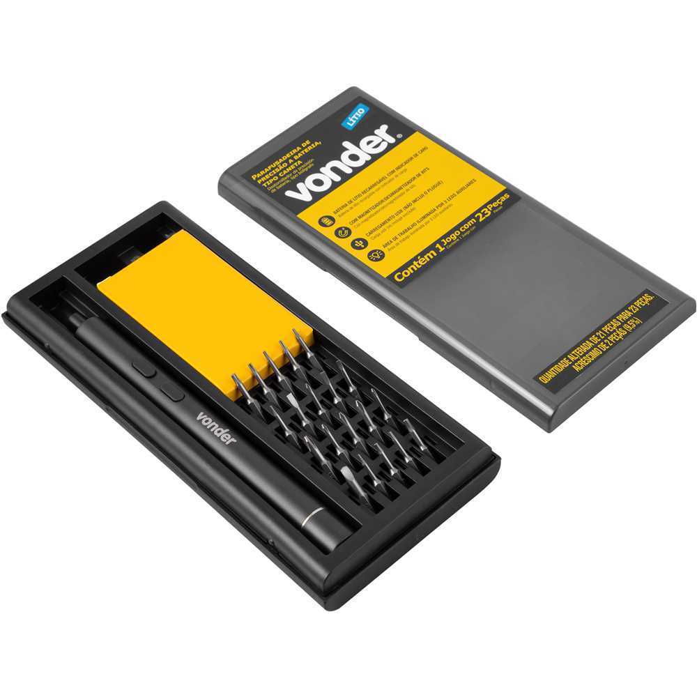 Parafusadeira de precisão a bateria 3,7 Voltz VONDER Conteúdo da Embalagem: Acompanha: 1 Parafusadeira de precisão a bateria. 1 estojo com magnetizador/desmagnetizador 1 cabo para carregamento (USB tipo C) 2 bits estrela (P, 2 P5) 1 bits triângulo (?3.0) 2 bits Allen (1,5 mm, 2 mm) 5 bits Phillips (PH0000, PH000, PH00, PH0 e PH1) 3 bits fenda (1,5 mm, 2 mm e 2,5 mm) 3 bits hexalobulares (T2, T3 e T4) 3 bits hexalobulares com furo (T5, T6 e T8) 1 bits Y (Y0,6). Possui 3 LEDs auxiliares, para melhor iluminação na área de trabalho, e bateria de lítio recarregável com indicador de carregamento. Conta com bits em material S2, proporcionando maior durabilidade e resistência. Possui proteção contra sobrecarga. Indicada para fixar e soltar parafusos. Ideal para trabalhos que necessitam de qualidade e precisão, como para uso em placas eletrônicas, computadores, monitores, smartphones, câmeras fotográficas, pequenos objetos, entre outros. Possui magnetizador/desmagnetizador embutido no estojo. Carregamento via cabo USB (não acompanha o plugue). Detalhes Técnicos: Modelo:Tipo Caneta Tensão da bateria:3,7 V Tipo de bateria:Lítio Tensão do carregador de bateria: Carregamento via cabo USB (não acompanha plugue) Frequência:50 Hz/60 Hz Tipo de mandril:Sextavado 5/32" - 3,97 mm Capacidade do mandril:5/32" - 4mm Sistema de reversão:Sim Tipo de velocidade:Fixa Rotação da furadeira/parafusadeira:200/min Luz de LED:Sim Segue norma:ABNT NBR IEC 60745-1 e ABNT NBR IEC 60745-2-2 Massa aproximada.:40 g Garantia: 3 meses Referência: 6001003700 Marca: VONDER *Imagens meramente ilustrativas.