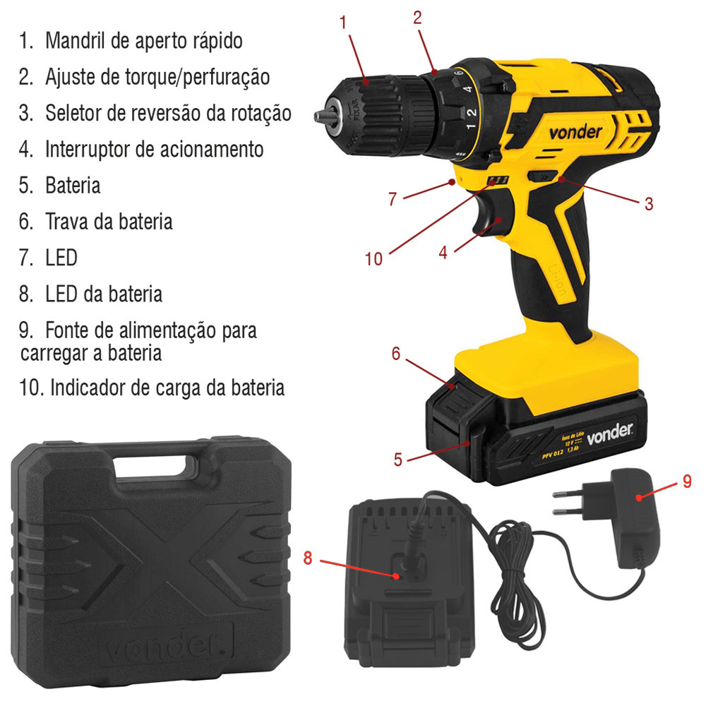 Parafusadeira E Furadeira 12V Sem Fio Com Maleta Broca e Bits Trena PFV 012 Vonder