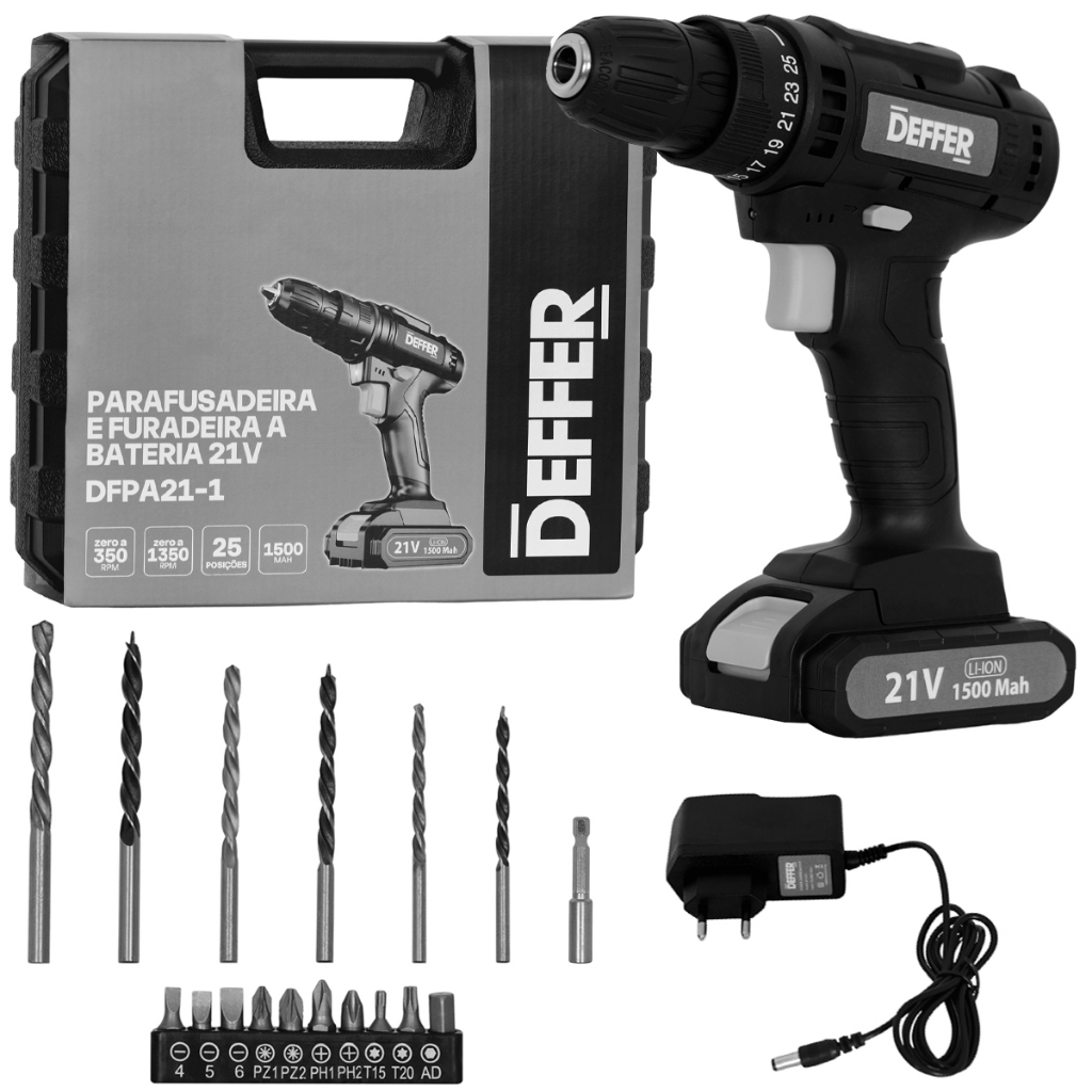 Parafusadeira e Furadeira a Bateria 21V Com Maleta + Kit Completo de Brocas e Bits - DEFFER