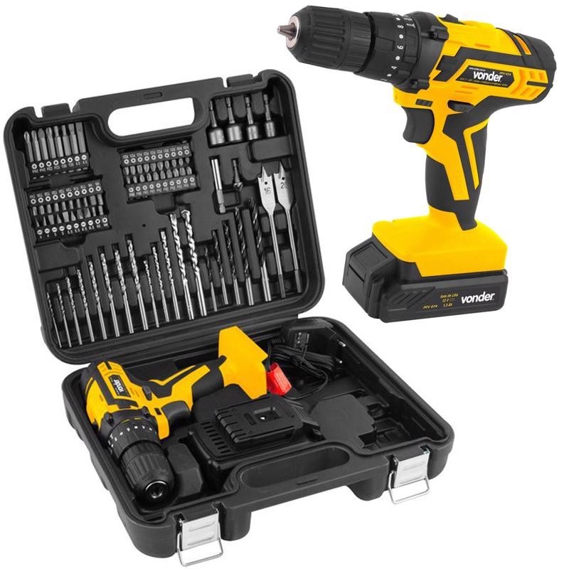 Parafusadeira e furadeira com Impacto à Bateria 12V Bivolt com Jogo 74 Peças e Maleta PFV 074 VONDER