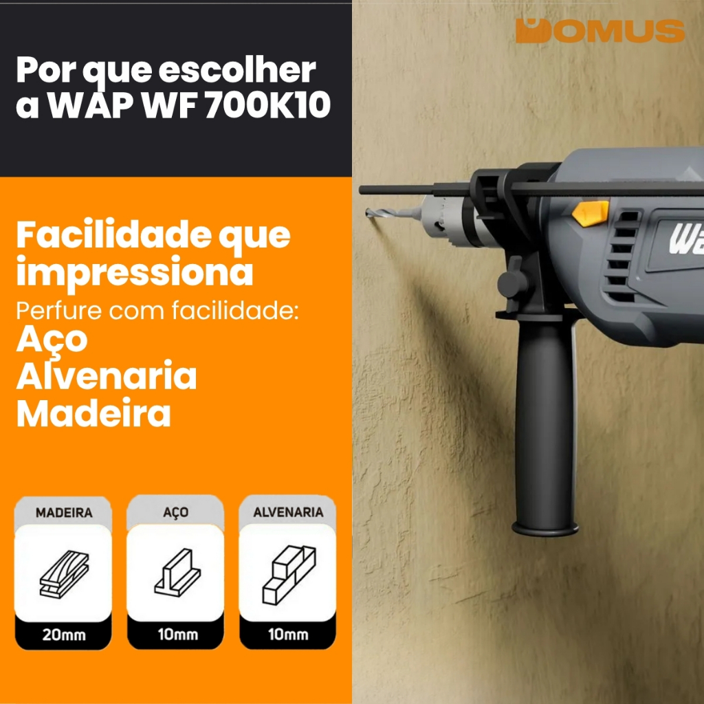 PRODUTO PRONTA ENTREGA COM ENVIO IMEDIATO Parafusadeira e Furadeira de Impacto WAP WF 700K10 Com 700W, 3000rpm e 48.000ipm, a WAP WF 700K10 une potência e controle para perfurar madeira, aço e alvenaria com segurança. O mandril 3/8 10mm aceita as brocas do dia a dia, o seletor reverso agiliza parafusar e desparafusar e o botão trava ajuda em serviços longos. Punho auxiliar multidirecional, limitador de profundidade e maleta com 11 acessórios completam um kit prático, portátil e eficiente para manutenção, instalações e reformas. DESTAQUES DO PRODUTO 700 W com impacto comutável para concreto/alvenaria e modo sem impacto para madeira/metal. Mandril 3/8" (10 mm) com chave: trocas seguras e firmes. 2 velocidades + controle eletrônico: ajuste fino da rotação para cada tarefa. Reversão e botão trava: parafusar/desparafusar e trabalho contínuo sem cansar o dedo. Punho auxiliar multidirecional + limitador de profundidade: mais estabilidade e repetibilidade. Maleta compacta com 11 acessórios: solução completa para começar já. ESPECIFICAÇÕES TÉCNICAS Tensão: 127 V ou 220 V (escolher na compra) Corrente: 4 A / 2 A Potência: 700 W Frequência: 60 Hz Mandril: 1–10 mm (3/8") Impactos por minuto: 48.000 ipm Rotações por minuto: 3.000 rpm Velocidades: 2 Torque: 40 Nm Perfuração madeira: 20 mm Perfuração aço: 10 mm Perfuração concreto: 10 mm Sistema reversão: sim Função impacto: sim Classe isolação: II Motor: universal Cabo elétrico: 1 m Códigos WAP: FW009637 (127 V) / FW009638 (220 V) Códigos EAN: 7899831313112 (127 V) / 7899831313129 (220 V) Cor: cinza e amarela CONTEÚDO DA EMBALAGEM 1 Parafusadeira/Furadeira WAP WF 700K10 1 Punho auxiliar multidirecional 1 Limitador de profundidade (régua) 1 Chave de mandril 1 Maleta organizadora 1 Trena 3 m 1 Chave Phillips 1 Chave de fenda 2 Brocas madeira (6 mm, 8 mm) 3 Brocas alvenaria (5 mm, 6 mm, 8 mm) 1 Martelo Manual do usuário GARANTIA 12 meses (3 meses garantia legal + 9 meses garantia especial do fabricante) OBSERVAÇÕES IMPORTANTES Escolher a tensão correta (127 V ou 220 V) na compra. Usar EPI adequado. Selecionar impacto apenas para concreto/alvenaria e broca compatível com o material.