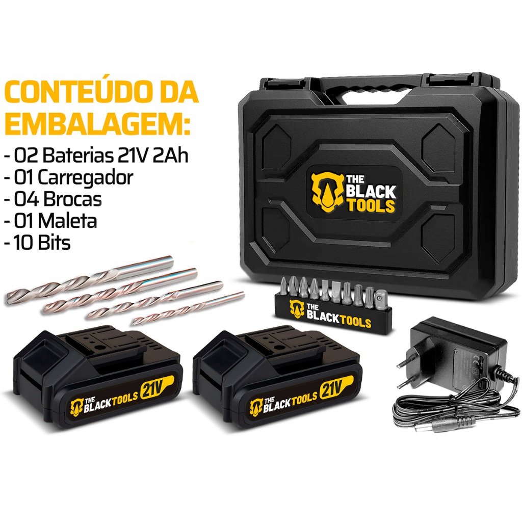 Parafusadeira E Furadeira De Impacto Sem Fio 2 Baterias 21v + Acessórios Com Maleta The Black Tools
