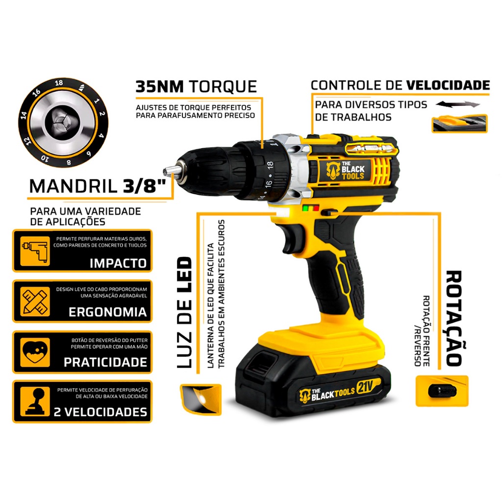 Parafusadeira E Furadeira De Impacto Tb-21pw 21v 3/8 Com Jogo De Soquetes 40 Peças + Acessórios