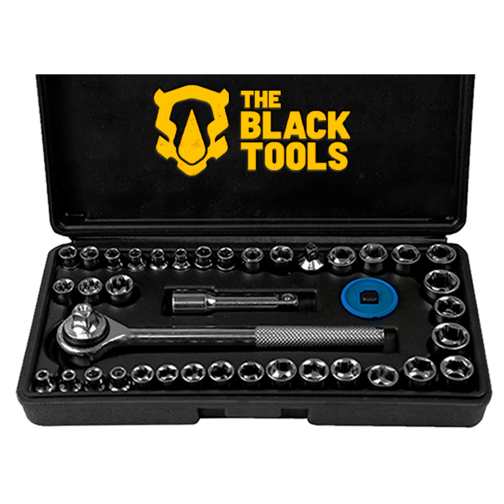 A The Black Tools é uma marca comprometida com a qualidade e as necessidades do cliente. Nosso objetivo é oferecer as melhores soluções para o seu dia a dia, com um design funcional e inovador. FURADEIRA PARAFUSADEIRA DE IMPACTO SEM FIO A BATERIA 21V 3/8 10MM COM MALETA E ACESSÓRIOS TB-21PW - The Black Tools A furadeira The Black Tools TB-21PW a bateria de 21V é uma ferramenta poderosa e versátil projetada para atender às necessidades de perfuração em diversos materiais; Com um design ergonômico e compacto, proporciona conforto durante o uso prolongado e facilita o manuseio em espaços restritos. APLICAÇÕES: - Ideal para perfuração em diversos materiais, como metal, madeira e plástico; - Profissionais da construção, marcenaria, bricolagem e uso doméstico. - 01 Broca de impacto multifuncional M8; - 04 Brocas helicoidais M2,3,4,5,6; - 01 Conector flexivel de 30 mm; - 01 Ponteira PH2+ST6 de 65 mm; - 01 Ponteira PH2 de 100 mm; - 01 Parafusadeira TB21PX; - 01 Carregador BIVOLT; - 02 Adaptadores; - 09 Soquetes; - 01 Baterias; - 01 Manual; - 10 Bits. FICHA TÉCNICA: - Diâmetro do mandril 3/8” 10mm (aperto rápido ); - Rotação sem carga : 0-400/0-1400 RPM; - Velocidade variável e reversível ; - Indicador de carga de bateria; - Empunhadura Soft Grip; - Opção de torque 18 + 3; - Função Impacto: Sim; - Bateria de 2000 mah.; - Torque Max 35.N.M; - Tensão: Bivolt ; - Bateria extra. Marca: The Black Tools Modelo: TB-21PW Peso: 1.300 Kg Dimensões (CxLxA): 25 x 6 x 20 cm Garantia: 06 meses + KIT DE CHAVES JOGO CATRACA REVERSÍVEL SOQUETES 40 PEÇAS COM MALETA TBT40 - The Black Tools O Kit Jogo Soquete The Black Tools TBT40P com catraca 40 peças, é uma ferramenta essencial para quem busca praticidade e eficiência em reparos e manutenções; Composto por 40 peças, incluindo soquetes de diversos tamanhos e uma catraca, é ideal para trabalhos em mecânica, elétrica e hidráulica. FICHA TÉCNICA: - Uso Doméstico; - Aço Carbono. ACOMPANHA: - 14 Soquetes 1/4" em milímetros: 4mm, 4,5mm, 5mm, 5,5mm, 6mm, 6,5mm, 7mm, 7,5mm, 8mm, 9mm, 10mm, 11mm, 12 e 13mm; - 14 Soquetes 1/4" em polegadas: 5/32", 3/16", 7/32", 1/4", 9/32", 5/16", 11/32", 3/8", 13/32", 7/16", 15/32", 1/2", 17/32", 9/16"; - 03 Soquetes 1/4" em polegadas (8pt): 1/4", 5/16", 3/8"; - 01 Catraca reversível 3/8"- comprimento: 17cm; - 02 Soquetes 3/8" em milímetros: 14mm, 15mm; - 01 Estojo para armazenamento; - 02 Soquetes 3/8: 5/8" , 11/16"; - 01 Adaptador 1/4" x 3/8"; - 01 Barra extensora 3"; - 01 Disco. Marca: The Black Tools Modelo: TBT40 Garantia: 03 Meses SKU: KIT24013_23375