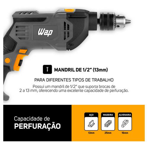 A Parafusadeira e Furadeira de Impacto WF 1000FE conta com 1000W de potência e com mandril de ½” (13mm) assegurando firmeza e precisão no uso de brocas e bits de 2 a 13mm. O suporte e a chave de mandril facilitam a troca de acessórios. A empunhadura emborrachada e a empunhadura auxiliar removível com limitador de profundidade metálico, que serve para limitar a profundidade do furo, de acordo com a necessidade, garantem uma adaptação adequada às características pessoais de cada usuário. A WF 1000FE possui a função impacto, que possibilita a perfuração de materiais duros como alvenaria (tijolos ou concreto), madeira e aço. Com o botão comutador você pode alternar facilmente entre as opções de furar com ou sem impacto, enquanto com o seletor do sentido de rotação você faz o uso em movimento horário e anti-horário, ideal para parafusar ou desparafusar, com torque máximo de 22Nm. O seletor de velocidade dá maior controle para cada tipo de trabalho, podendo também ser usado com velocidade gradual. Gire no sentido horário para alta velocidade, e no sentido anti-horário para baixa velocidade. Para utilizar a ferramenta continuamente, o botão trava pode ser acionado junto ao gatilho para ligar o produto. O LED indicador de alimentação informa quando a ferramenta está conectada a tomada e pronto para o uso, aumentando a segurança e confiança durante a tarefa. A WF 1000FE possui caixa de engrenagens em metal, o que ajuda na dissipação de calor e aumenta a vida útil do produto. A Parafusadeira e Furadeira de Impacto WAP WF 1000FE é solução para os seus projetos. Características Principais Copiar informações Possui 1000W de potência e mandril de ½" (13mm) assegurando firmeza e precisão no uso de brocas e bits de 2 a 13mm. Empunhadura emborrachada garante uma adaptação adequada às características pessoais de cada usuário. Empunhadura auxiliar removível com limitador de profundidade metálico, serve para limitar a profundidade do furo, de acordo com a necessidade. Função impacto: possibilitar a perfuração de materiais duros como alvenaria (tijolos ou concreto), madeira e aço. Botão comutador: alternar facilmente entre as opções de furar com ou sem impacto. Seletor do sentido de rotação: parafusar e desparafusar de maneira rápida, com torque máximo de 22Nm. Seletor de velocidade: ajustar a velocidade de acordo com o material e o projeto, podendo ser usado também com velocidade gradual. Botão trava: para uso contínuo. LED indicador de alimentação: informa quando a ferramenta está conectada a tomada. Caixa de engrenagens em metal: ajuda na dissipação de calor e aumenta a vida útil do produto. Suporte e a chave de mandril para a troca de acessórios.