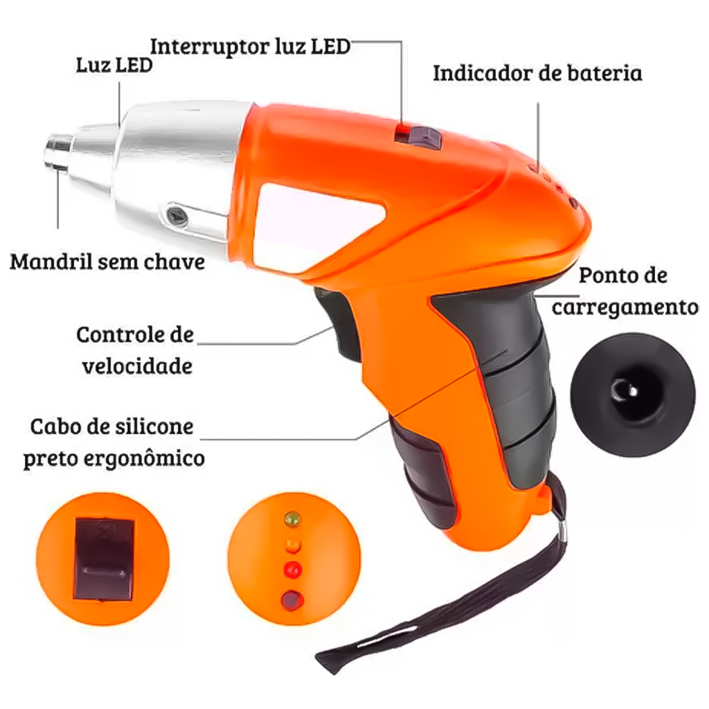 Parafusadeira Elétrica Portátil Com Led Trabalho Kit 45 Peças Acessórios 4.8V Recarregável USB