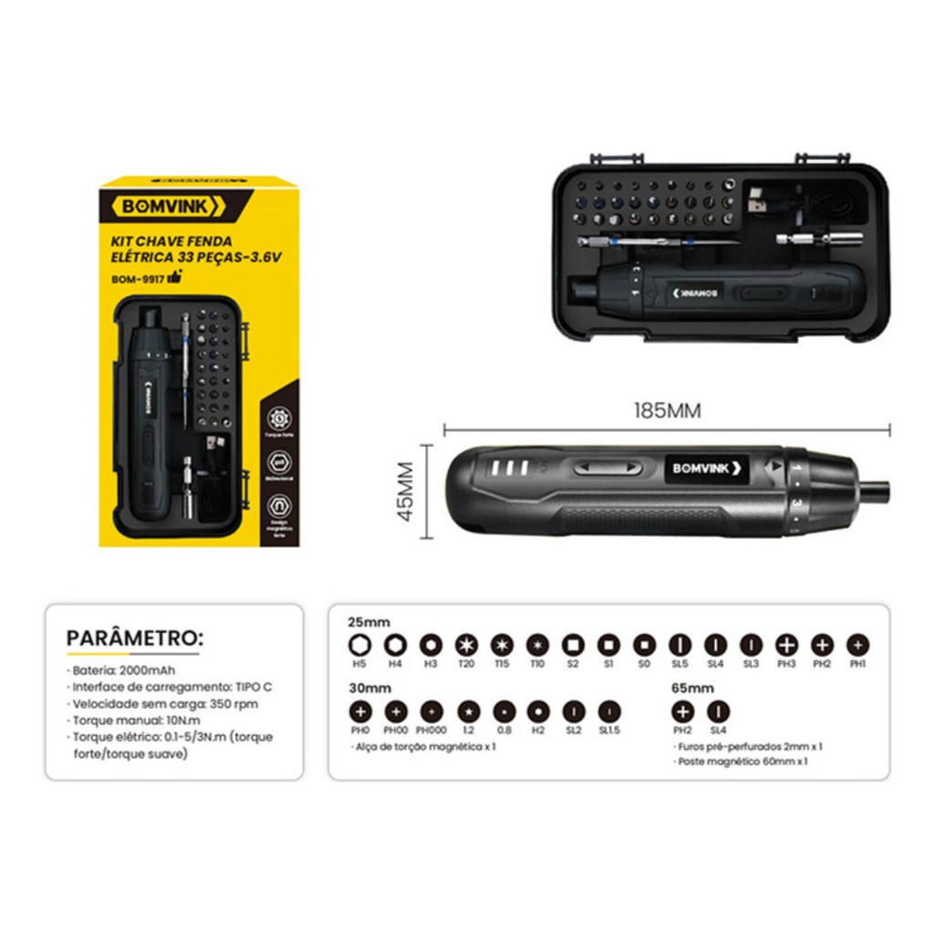 Parafusadeira Elétrica Portátil Usb 3,6v 2000mah Com 33 peças