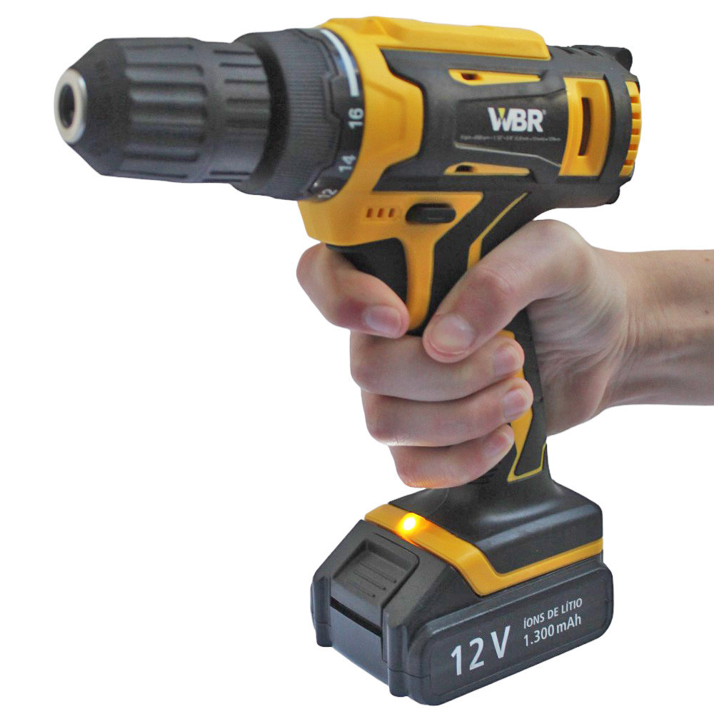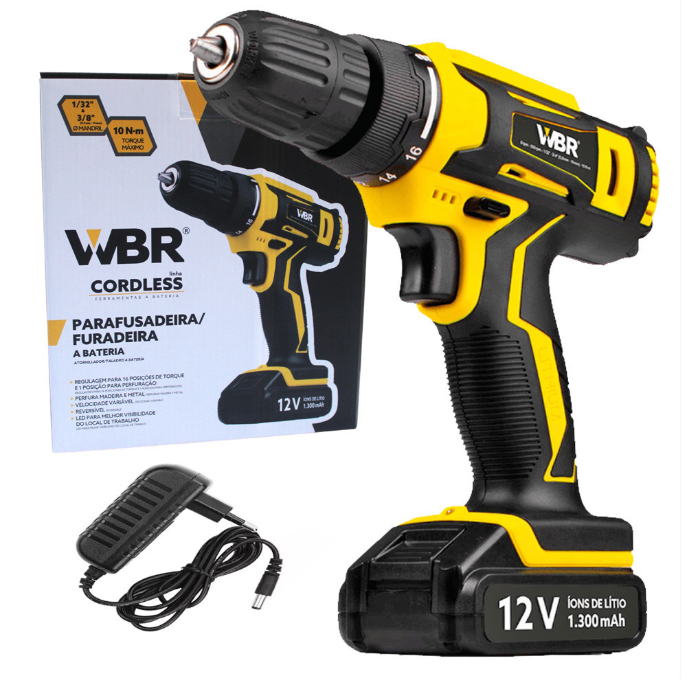 Parafusadeira Furadeira 10Nm Regulagem para 16 posições de torque e 1 posição para perfuração; Perfura madeira e metal; Velocidade variável; Reversível; LED para melhor visibilidade do local de trabalho; Cabo com revestimento emborrachado, maior conforto; Baterias de íons de lítio, alta eficiência de operação; Carregador bivolt automático; Informações Técnicas: Código: 323119 Linha: CORDLESS Marca: WBR Bateria: 12v (1.300 mAh) Tensão do Carregador: 127v / 220v (Bivolt) Frequência do Carregador: 50/60hz Torque Máximo: 10nm Diâmetro do Mandril: 3/8 Polegada (0,8 - 10mm) Velocidade: 0 - 500 Rpm Luz Led: Sim Velocidade Variável: Sim Reversível: Sim Peso: 1,6kg