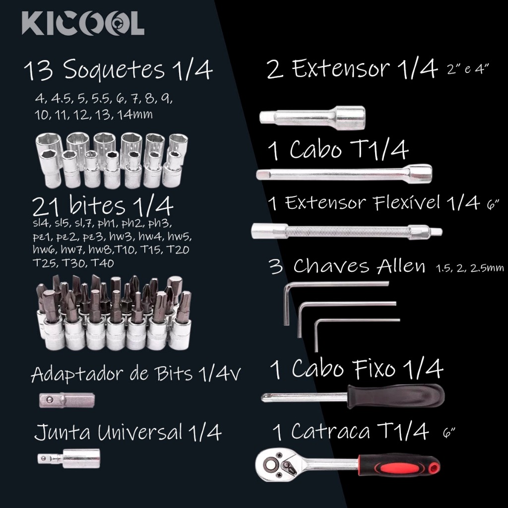 VANTAGENS: - Facilidade de uso. - Versatilidade. - Durabilidade. - Eficiência. FICHA TÉCNICA: - Velocidade variável e reversível . - Empunhadura Soft Grip. - Voltagem: Bivolt - Torque: 35Nm Itens Incluso: 01 Parafusadeira 21V 01 Carregador Bivolt 02 Baterias 01 Maleta para Transporte 01 Manual ESPECIFICAÇÕES: - 46 PEÇAS; - Maleta de termo plástico; - Ferramentas de aço cromo vanádio; - Medidas 24x13x5 (C, L, A); - Peso - Encaixes de 1/4 padrão sextavados LISTA DE EMBALAGEM: - 13 Soquetes ¼”: - 4 mm - 4,5 mm - 5 mm - 5,5 mm - 6 mm - 7mm; - 8 mm - 9 mm - 10 mm - 11 mm - 12 mm - 13 mm - 14 mm; - 21 Soquete com Bits: - Ponta Fenda: 4 mm - 5,5 mm - 7 mm; - Ponta Hexagonal: 3 mm - 4 mm - 5 mm - 6 mm - 7 mm - 8 mm - Ponta Philips: 1 - 2 - 3; - Ponta POZI: 1 - 2 - 3; - Ponta Torx: T10 - T15 - T20 - T25 - T30 - T40; - 03 Chaves Hexagonais L: 1,5 mm - 2 mm - 2,5 mm; - 01 Cabo Fixo ¼”; - 02 Extensão 50 mm (2”) e Extensão 100 mm (4”); - 01 Extensão Flexível 150 mm (6”); - 01 Catraca Reversível ¼” com Quick Release: 15 x 2,7 x 2,3 cm. - 01 Cabo de Força T; - 01 Junta Universal; - 01 Bit Adaptador; - 01 Maleta. ( TRES CORES DIFERENTE, AZUL, VERMELHA E PRETA) Kit de ferramentas chave soquete chave de aperto chave de fenda ferramenta