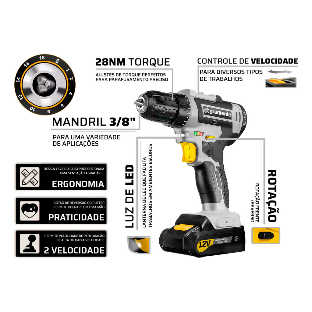 Distribuído por Ismafer Ferramentas Furadeira/Parafusadeira a Bateria de Lítio 12V Gradiente A Furadeira/Parafusadeira a Bateria de Lítio 12V é a ferramenta ideal para quem busca praticidade e eficiência em suas tarefas de perfuração e parafusamento. Com um design compacto e leve, ela oferece excelente desempenho e conforto durante o uso, sendo perfeita para trabalhos em locais de difícil acesso. Características: - Tensão: 12V - Tipo de Bateria: Íon de Lítio - Velocidade Variável: Permite ajustar a velocidade conforme a necessidade do trabalho - Torque Ajustável: Oferece diferentes níveis de torque para diversas aplicações - Mandril de Aperto Rápido: Facilita a troca de brocas e bits - Luz LED Integrada: Ilumina a área de trabalho, proporcionando maior precisão em ambientes com pouca iluminação - Indicador de Nível de Bateria: Mostra a carga restante da bateria, evitando surpresas durante o uso Vantagens: - Portabilidade: Leve e compacta, ideal para uso em locais de difícil acesso - Eficiência: Bateria de íon de lítio que proporciona maior autonomia e durabilidade - Versatilidade: Adequada para uma ampla gama de aplicações, desde perfuração em madeira e metal até parafusamento em diversos materiais Conteúdo da Embalagem: - 01 Furadeira/Parafusadeira a Bateria de Lítio 12V - 01 Carregador de Bateria - 01 Bateria de Íon de Lítio - 01 Conjunto de Brocas e Bits - Manual de Instruções Garantia: 12 meses SKU:24324 Distribuído por Ismafer Ferramentas