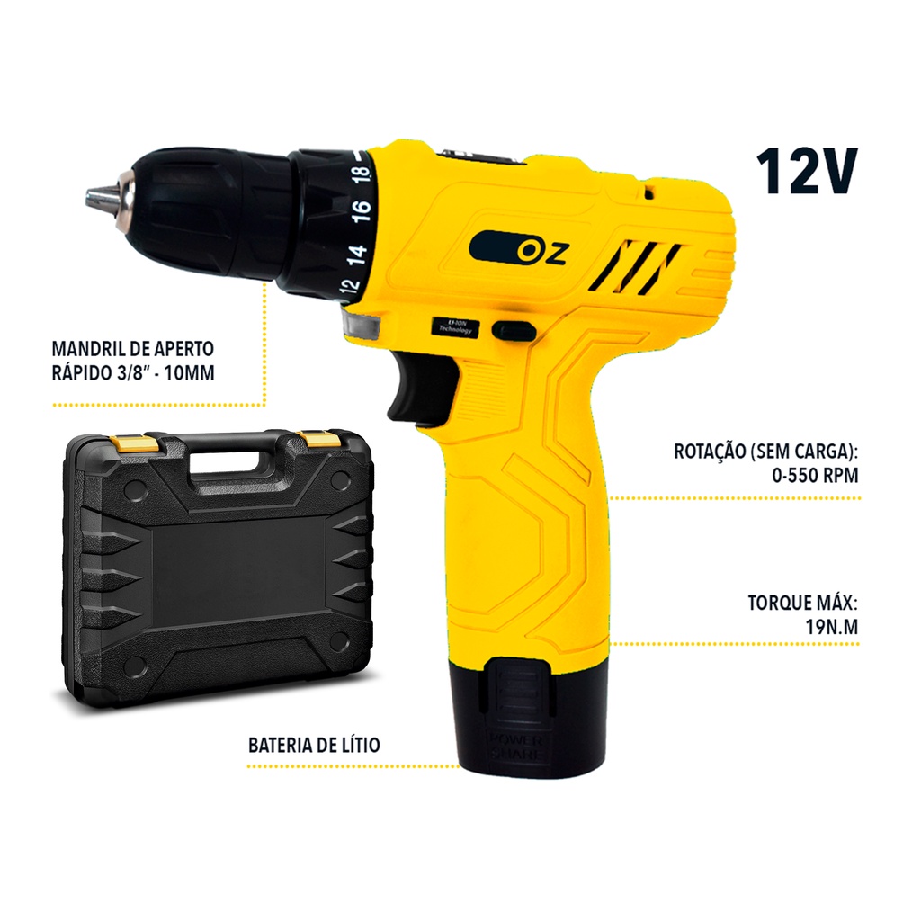 Distribuído Por Ismafer Ferramentas Furadeira / Parafusadeira 12V Litio Com Maleta Oz PB3000k A Furadeira/Parafusadeira a bateria de Lítio 12V – PB3000K da Oz, é ideal para trabalhos leves de perfurações em madeira e metal além de exercer a função de aperto e retirada de parafusos e porcas. Acompanha acessórios encaixados perfeitamente na maleta, conferindo organização, praticidade e maior vida útil dos acessórios. Acompanha: - 10 bits - 1 conector - 4 brocas - 1 bateria - 1 carregador - 1 maleta Características: - Mandril De Aperto Rápido 3/8" - 10mm - Rotação (Sem Carga): 0 - 550Rpm - Torque Máximo: 19Nm - Bateria 12v de Lítio - Garantia: 1 Ano pelo Fabricante .:: Sku: 21640 Distribuído Por Ismafer Ferramentas