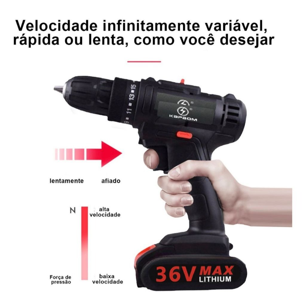 Transforme seus projetos de bricolagem com esta poderosa Parafusadeira e Furadeira Elétrica Sem Fio, a ferramenta perfeita para profissionais e entusiastas do faça você mesmo. Com tecnologia avançada e uma gama completa de funcionalidades, ela garante eficiência e precisão em cada tarefa. Veja por que este é o equipamento que você precisa: Características Principais: Bivolt e Bateria de Lítio: Equipado com 1 baterias de lítio de 36 volts, você pode usar a ferramenta em qualquer lugar, sem se preocupar com tomadas ou cabos. Duas Opções de Velocidade: Escolha entre duas configurações de torque ajustáveis para adequar a ferramenta às suas necessidades: Parafusadeira: 0-600 rpm para um trabalho de parafusamento preciso. Furadeira: 0-2000 rpm para perfurações rápidas e eficazes. Iluminação LED Integrada: A luz de LED incorporada ilumina áreas escuras, permitindo que você trabalhe com mais precisão em locais de baixa visibilidade. Extensor Flexível: Inclui um extensor flexível para alcançar e trabalhar em lugares de difícil acesso com facilidade. Versatilidade: Ideal para uma ampla gama de aplicações, desde montagens de móveis até reparos e projetos de construção. Eficiência: As baterias de lítio garantem maior durabilidade e menor tempo de recarga, mantendo a ferramenta sempre pronta para uso. Conforto e Praticidade: A ausência de fios e o design ergonômico tornam o manuseio mais confortável e menos cansativo, mesmo em longas sessões de trabalho. Informações Técnicas: Parafusadeira Furadeira 36V Torque máximo 50Nm Torque ajustável 0-600rpm / 0-2000rpm Luz de Led acionada durante o uso Baterias de lítio 36V 2100 mAh Potência: 340W Tensão: 100-240VAC 50/60Hz Não Acompanha Brocas 1 Baterias Preto 36v Itens Inclusos: 1x Baterias 36v Recarregável 2xfurar 1x Carregador 1x Caixa de papel 1 Baterias Preto 12v ITENS INCLUSOS 1* Parafusadeira Furadeira 12V 1* Carregador Bivolt. 1 *Baterias. (BATERIAS EM FORMATO ACHATADO).