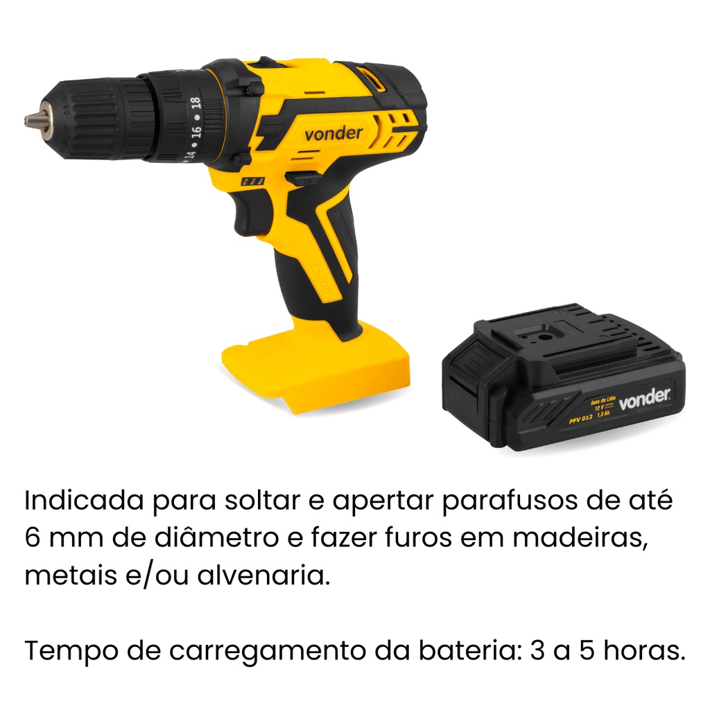 ***PRODUTO PRONTA ENTREGA COM ENVIO IMEDIATO*** 1 Parafusadeira/furadeira. 1 maleta 1 bateria de 12 V 1 fonte bivolt automática 5 brocas de madeira (10 mm, 8 mm, 6 mm, 5 mm e 4 mm) 8 brocas de aço rápido (6,5 mm, 6 mm, 5,5 mm, 5 mm, 4,5 mm, 4 mm, 3,5 mm e 3 mm) 5 brocas de alvenaria (10 mm, 8 mm, 6 mm, 5 mm e 4 mm) 2 brocas chatas para madeira (20 mm e 16 mm) 1 escareador 8 bits 25 mm hexalobular (T10, T15, 2 peças T20, 2 peças T25, T30 e T40) 8 bits 25 mm fenda (2 peças SL 4 mm, 2 peças SL 5 mm, 2 peças SL 5,5mm e 2 peças SL 6,5 mm) 4 bits 25 mm allen (H3, H4, H5 e H6) 10 bits 25 mm pozidrive (2 peças PZ0, 2 peças PZ1 3 peças PZ2 e 3 peças PZ3) 10 bits 25 mm philips (2 peças PH0, 2 peças PH1, 3 peças PH2 e 3 peças PH3) 2 bits 50 mm philips (PH2 e PH3) 2 bits 50 mm pozidrive (PZ2 e PZ3) 2 bits 50 mm hexalobular (T15 e T20) 2 bits 50 mm fenda (SL 5,5 e SL 6,5) 1 soquete magnético encaixe de 1/4" 4 soquetes sextavados magnéticos (13 mm, 12 mm, 10 mm e 8 mm). Acompanha 74 acessórios encaixados perfeitamente na maleta, conferindo organização, praticidade e maior vida útil dos acessórios. Possui regulagem para 18 posições de torque e velocidade variável (2 velocidades). Contém 3 funções de operação: parafusadeira, furadeira sem impacto e furadeira com impacto. Possui LED para melhor visibilidade do local de trabalho, indicador de carga da bateria, cabo com revestimento emborrachado proporcionando maior conforto ao operador, bateria de íons de lítio que confere alta eficiência de operação, além de fonte bivolt automática com tensão de entrada de 100 V~ - 240 V~. Indicada para soltar e apertar parafusos de até 6 mm de diâmetro e fazer furos em madeiras, metais e/ou alvenaria. Tempo de carregamento da bateria: 3 a 5 horas.