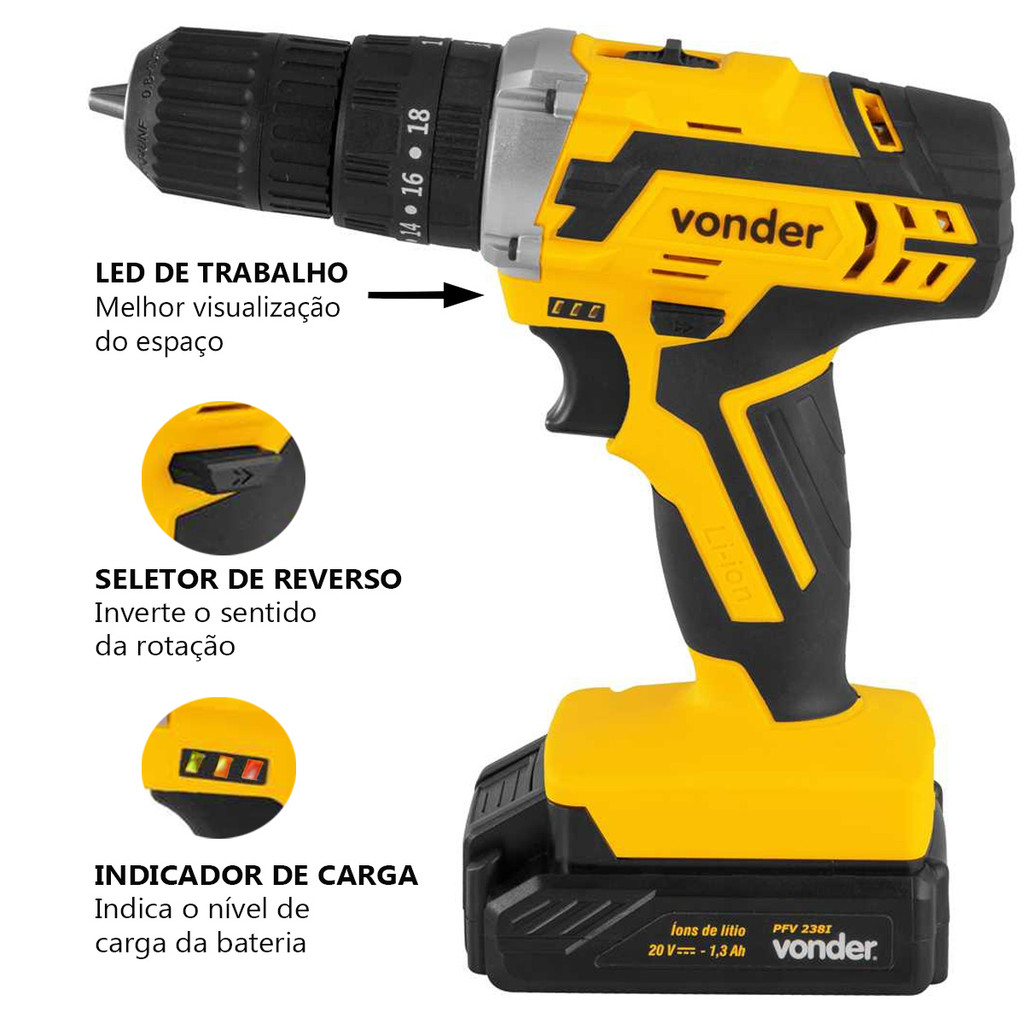 Parafusadeira Furadeira de Impacto 20v Sem Fio Com Maleta Broca e Bits PFV238I Vonder