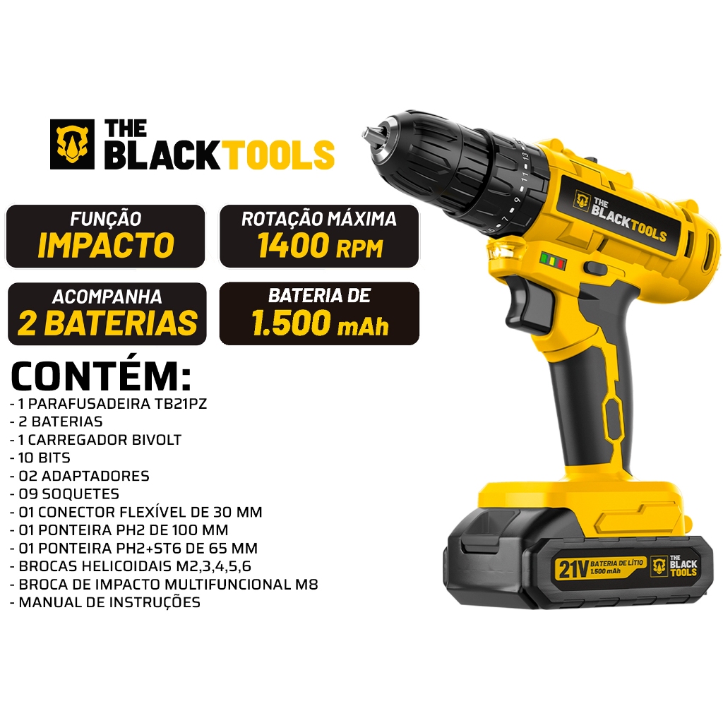 Parafusadeira Furadeira Impacto 21v 02 Bat The Black Tools + Kit De Brocas Bits E Buchas 300 Peças
