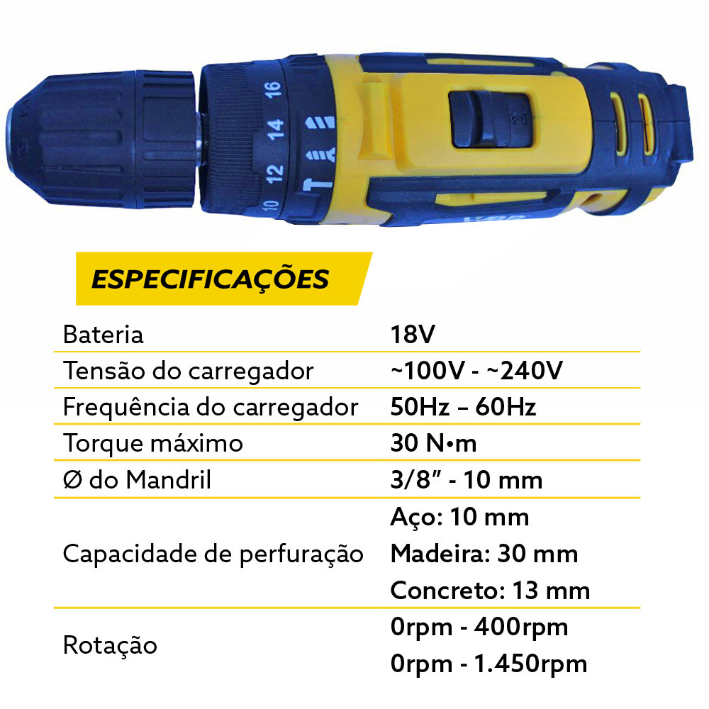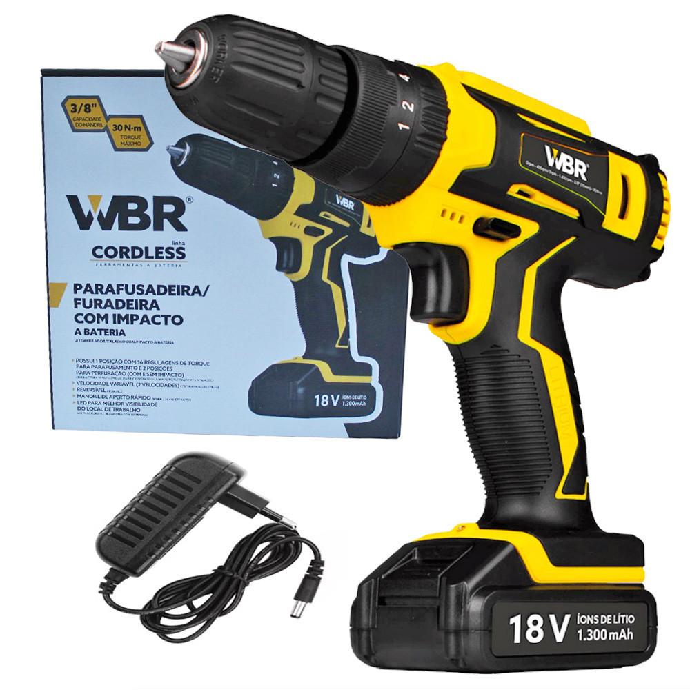 Parafusadeira Furadeira com Impacto 30Nm Possui 1 posição com 16 regulagens de torque para parafusamento e 2 posições para perfuração (com e sem impacto); Velocidade variável; Reversível; Mandril de aperto rápido; Indicador de luz LED; Cabo com revestimento emborrachado; Bateria de íons de lítio, alta eficiência de operação; Carregador bivolt automático; Informações Técnicas: Código: 323135 Linha: CORDLESS Marca: WBR Bateria: 18v Tensão do Carregador: 127v / 220v (Bivolt) Frequência do Carregador: 50/60hz Diâmetro do Mandril: 3/8 Polegada (10mm) Velocidade: 0 - 400 Rpm Torque Máximo: 30Nm Luz Led: Sim Velocidade Variável: Sim Reversível: Sim