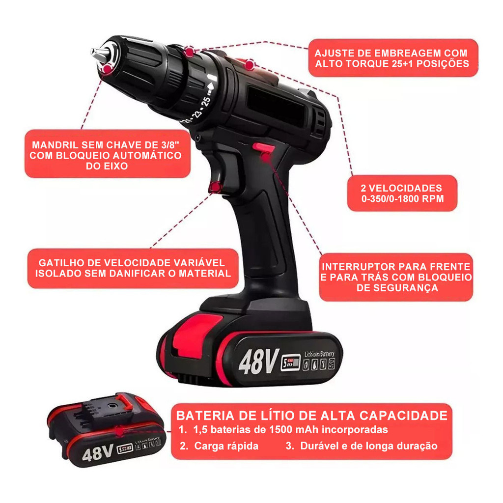 | Parafusadeira Furadeira Impacto Profissional 48V Bivolt c/2 Bateria... este produto | R$ 118,00 | 61% | 4.8/5 | — |