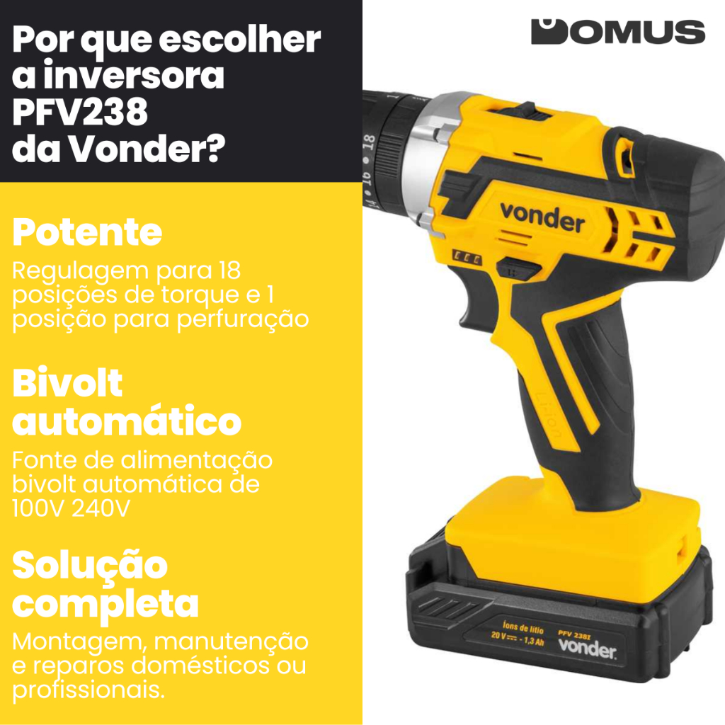 Parafusadeira Furadeira PFV238I Com Impacto 20V Bateria 2 Velocidades Mandril 13mm Vonder