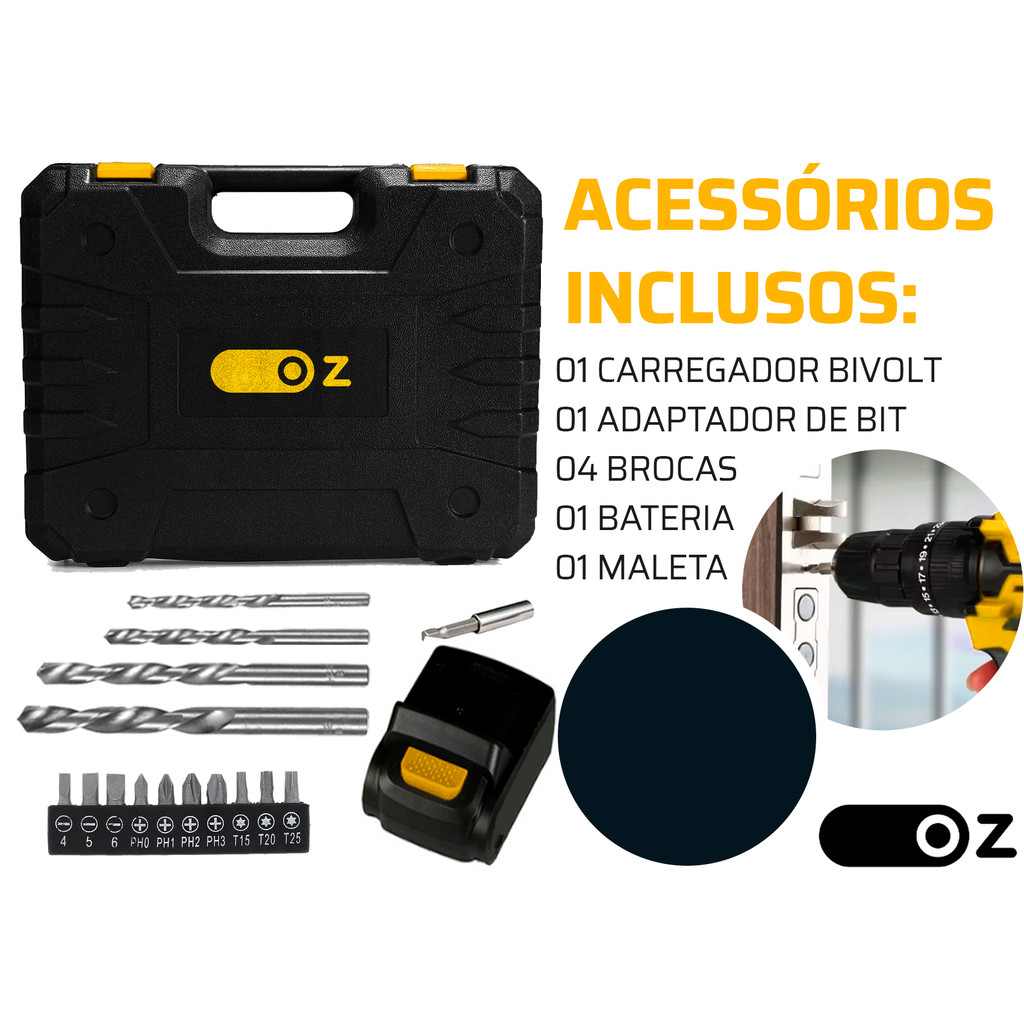 PARAFUSADEIRA FURADEIRA SEM FIO 10MM 12V A BATERIA COR AMARELO 127/220V PB3200K Oz Para quem busca praticidade e efetividade nas diversas tarefas manuais, a parafusadeira e furadeira PB3200K Oz Com design único e exclusivo, uma ferramenta compacta, robusta, ideal para você. Vem com mandril de aperto rápido e design ergonômico, que garante maior conforto ao utilizar. VANTAGENS: - Bivolt, opera com bateria recarregável de tecnologia lítio (Li-on), o que traz maior vida util ao produto e proporciona ter a ferramenta sempre a mão. - Somado o ajuste de velocidade, a ferramenta oferece mais produtividade e economia de tempo - Tem led indicativo de nível da bateria, que sinaliza o momento de recarregar. - O LED embutido ajuda a clarear e ter visibilidade do local de trabalho. - Possui indicador de Carga INDICAÇÃO: - Seja para apertar ou soltar parafusos, você tem o controle através do seletor de reverso, que inverte o sentido de rotação para o uso adequado a cada necessidade. - Com seletor de torque de 18 níveis para parafusar e 1 nível para perfurar, é possível ajustar para os mais adequados tipos de trabalhos a serem realizados. - Pode ser usada para materiais como: tijolos, madeiras, cerâmicas, metais entre outros. ITENS INCLUSOS: - 01 Furadeira E Parafusadeira; - 01 Conector para bits; - 10 Bits de parafuso; - 01 Carregador; - 04 Brocas; - 01 Manual; - 01 Bateria; - 01 Maleta. CARACTERÍSTICAS: - Capacidade da Broca (mm): >10(Aço)/>25(Madeira); - Rotação: 0-350/0-1350 RPM:: Baterias 1300 mah; - Diâmetro do mandril 3/8” 10mm (aperto rápido ); - Led Indicador de Carga da Bateria; - Velocidade variável e reversível; - Indicador de carga de bateria; - Torque máximo (N*M): 20; - Empunhadura Soft Grip; - 25 + 1 opção de torque; - LED para iluminação; - Voltagem Bivolt. Marca: Oz Modelo: PB3200K
