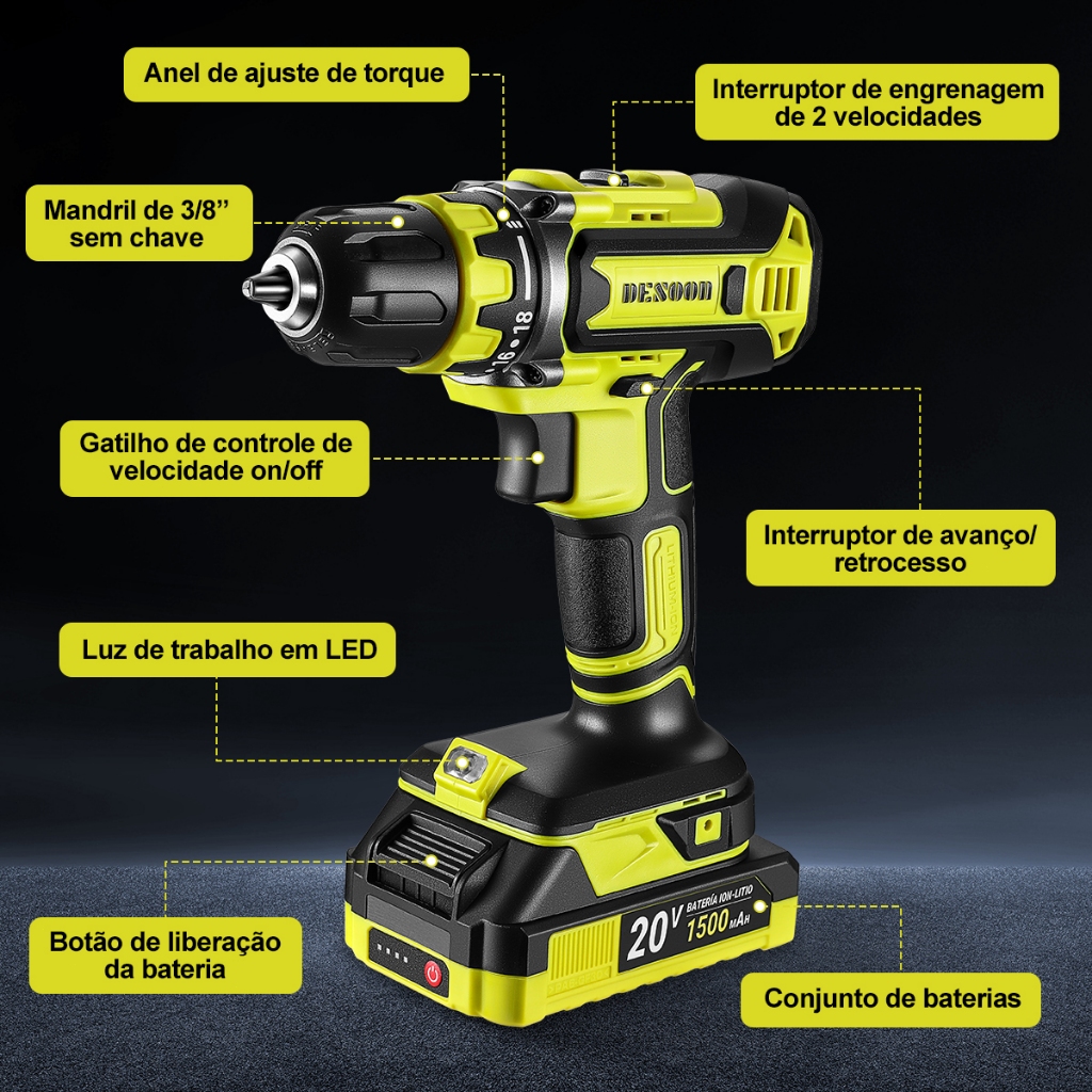 Parafusadeira Furadeira Sem Fio 1500mah 2 Bateria Com Maleta 20v Carga Rápida De 1Hora Bivolt Desoon