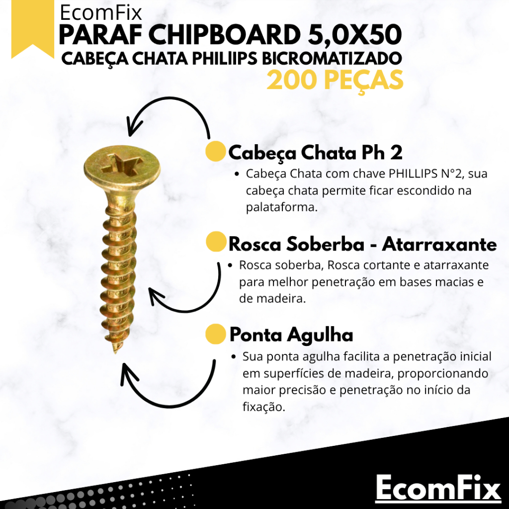 Parafuso Chipboard - Caixa com 200 Peças Especificações: - Modelo: Chipboard - Medida: 5,0mm x 50mm - Quantidade: 200 peças - Cabeça: Chata Phillips - Rosca Cortante: Profunda para alta fixação - Material: Aço carbono - Acabamento: Bicromatizado (proteção contra corrosão) Aplicações: - Fixação em MDF, MDP e madeira macia - Montagem de móveis e marcenaria - Projetos de carpintaria e bricolagem