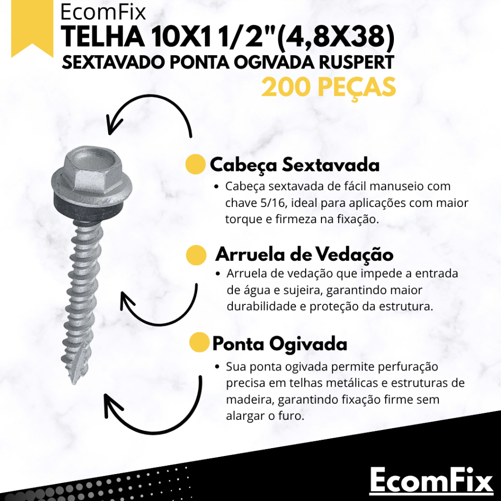 Parafuso para Telha Metálica e Amianto 4.8x38mm – Estrutura de Madeira – JOMARCA (Caixa com 200 Peças) O parafuso JOMARCA 4.8x38mm é indicado para fixação de telhas metálicas e de fibrocimento (amianto) em estruturas de madeira. Produzido em aço carbono com acabamento Ruspert 1000Hrs, oferece alta resistência à oxidação, durabilidade e proteção superior contra corrosão. Indicado para: Telhas metálicas e de fibrocimento (amianto) Estruturas de madeira Aplicações residenciais, comerciais e industriais Características: Medida: 4.8 x 38mm Cabeça sextavada Arruela com vedação EPDM Material: Aço carbono Acabamento: Ruspert 1000Hrs Alta durabilidade e resistência Embalagem com 200 unidades - 2 Caixas cm 100 Unds