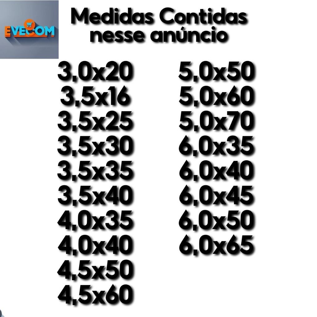 As medidas desses parafusos são lidas da seguinte forma, exemplo parafuso 3,0x20 (os dígitos da direita "3,0" representam o diâmetro, os dígitos da esquerda "20" representam o comprimento, nesse exemplo é 3mm de diâmetro por 20mm de comprimento. Medidas e quantidade do anúncio: ➜ 3,0x20 - 100 unidades ➜ 3,5x16 - 100 unidades ➜ 3,5x25 - 100 unidades ➜ 3,5x30 - 100 unidades ➜ 3,5x35 - 100 unidades ➜ 3,5x40 - 100 unidades ➜ 4,0x35 - 100 unidades ➜ 4,0x40 - 100 unidades ➜ 4,5x50 - 100 unidades ➜ 4,5x60 - 100 unidades ➜ 5,0x50 - 100 unidades ➜ 5,0x60 - 100 unidades ➜ 5,0x70 - 100 unidades ➜ 6,0x35 - 100 unidades ➜ 6,0x40 - 100 unidades ➜ 6,0x45 - 100 unidades ➜ 6,0x50 - 100 unidades ➜ 6,0x65 - 100 unidades