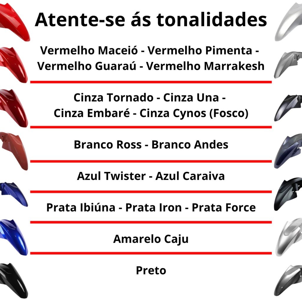 QUALIDADE ORIGINAL PRO TORK – XR2 MOTOS Evite erros na sua compra! Utilize nosso guia de compatibilidade abaixo para escolher a cor exata do modelo da sua moto. Nossos paralamas seguem o padrão original de fábrica, garantindo encaixe perfeito e durabilidade. GUIA DE CORES E COMPATIBILIDADE (PRO TORK): PRETO (Cód. 018-1007): Titan/Fan 150 (2014) e Titan/Fan 160 (2016 a 2020). VERMELHO MACEIÓ (Cód. 018-1006): Titan/Fan 150 (2014/15) e Titan/Fan 160 (2016, 2019/20). VERMELHO PIMENTA (Cód. 018-1011): Titan 150 (2014). VERMELHO MARRAKESH (Cód. 018-1010): Titan 160 (2016 a 2018). VERMELHO GUARAU (Cód. 018-1014): Fan e Start 160 (2017/18). BRANCO ROSS (Cód. 018-1009): Titan 150 (14/15), Titan 160 (16/17) e Fan 160 (2018). AZUL TWISTER (Cód. 018-1012): Titan e Fan 150 (2014). PRATA FORCE (Cód. 018-1015): Titan 160 EX (2019). PRATA IBIUNA (Cód. 018-1017): Fan 160 EX (2020). CINZA TORNADO (Cód. 018-1008): Fan 150 (2015) e Fan 160 (2016). CINZA UNA (Cód. 018-1016): Fan 160 (2019). ESPECIFICAÇÕES: Marca: Pro Tork. Material: Plástico ABS de alta resistência. Instalação: Padrão original, sem necessidade de adaptações. INFORMAÇÕES DE GARANTIA: Garantia: 3 meses exclusivamente contra defeitos de fabricação. Aviso: Não acompanha parafusos. Recomendamos que a instalação seja feita por um profissional qualificado. DIFERENCIAIS XR2 MOTOS: Shopee entrega rápida: Receba hoje mesmo em SP e região (comprando até as 13h)! PRONTA ENTREGA: Produto em estoque com envio imediato.