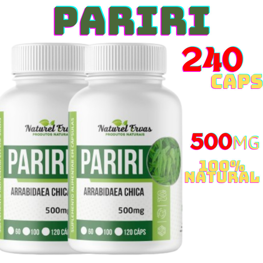 REALIZAMOS O ENVIO NO MESMO DIA! Suplemento Alimentar 100% Natural ----------------------------------------------------------------------------------------------- APRESENTAÇÃO: Cápsulas de 500 mg. * Sem Glúten * Sem Lactose * Livre de Aditivos CONTEÚDO: 1 FRASCO COM 120 CÁPSULAS / 500MG CADA COMPOSIÇÃO: - Pariri (Arrabidaea chica) 500mg Nomes populares, Arrabidaea chica, Pariri, Crajiru, Cipó Cruz, Carajurú, Puca panga, Cipo-pau, Piranga.