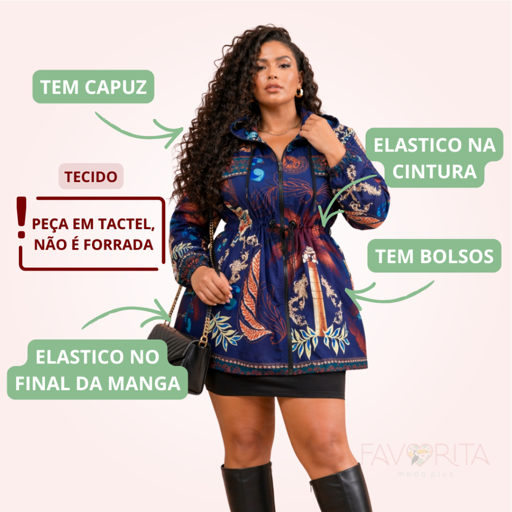 Parka Corta Vento em Tactel Plus Size Inspiração Estampa Tropical Chique Tendência