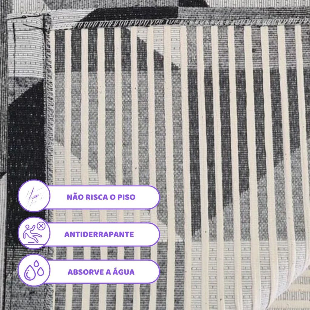Tapete Passadeira Emborrachado para deixar casa ainda mais elegante e confortável, pois conta com uma construção de excelente qualidade, e acabamentos impecáveis, confeccionada por profissionais com anos de experiência na área. Sua base emborrachada permite que ele seja antiderrapante além de proteger os seus pés do solo. Contém: 01 Tapete Passadeira: 2,00m Comprimento x 0,65m Largura. Composição: 72% Algodão. 28% Poliéster. Seus Principais Pontos Fortes são: Melhor da categoria. Acabamento impecável em bainha. Antiderrapante. Textura em Jacquard Rústica. Não Risca o Piso. Absorve totalmente a água. Super leve e fácil de transportar. Cores que combinam com qualquer ambiente. Material de alta qualidade. Pratico na hora de lavar e higienizar. Extrema qualidade. Modo de lavagem: Temperatura máxima de lavagem 60°C, processo suave. Não alvejar. Não secar em tambor. Temperatura máxima da base do ferro 110°C. Não limpar a seco. Boa compra!