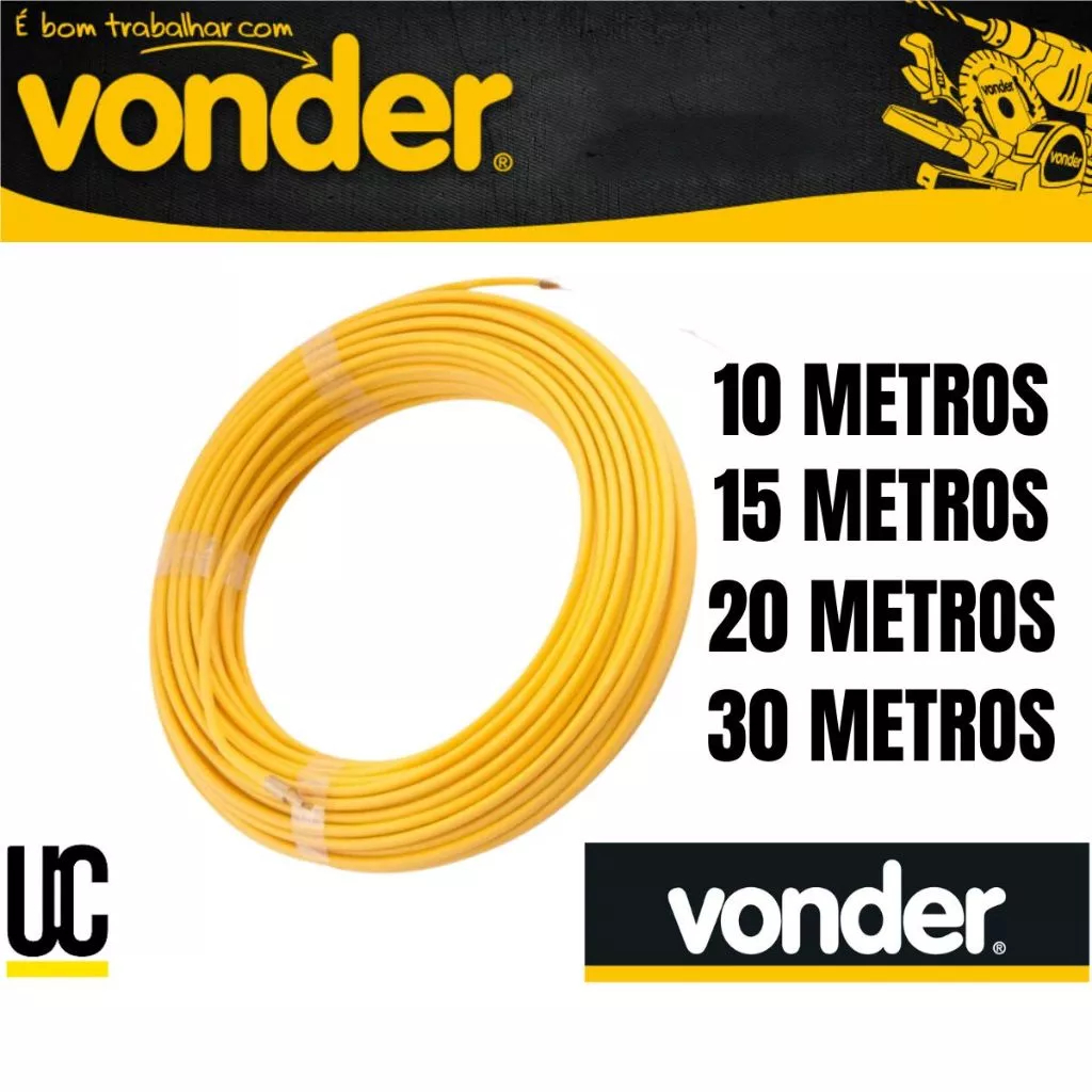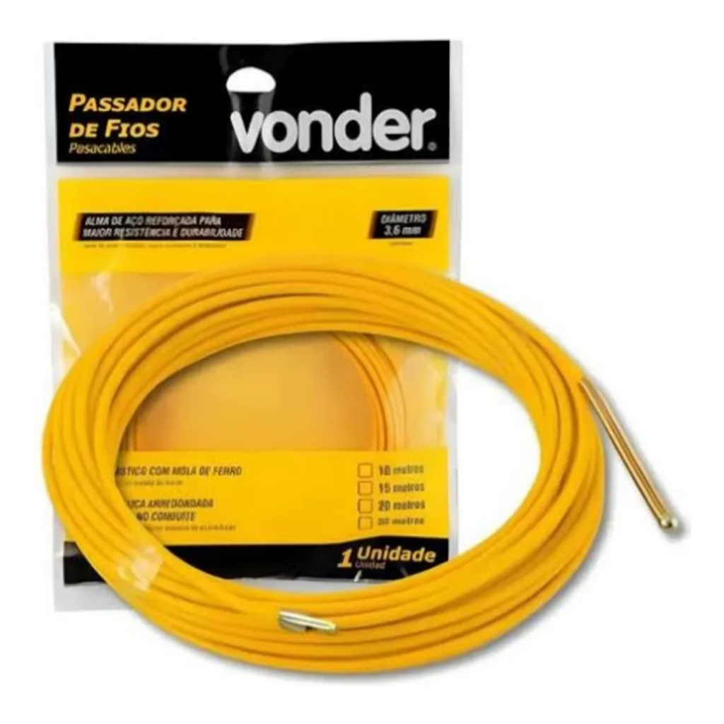 Características do Produto : * Indicado para passagens de fios e cabos em condutores elétricos, utilizado na construção civil e obras residenciais de pequeno, médio e grande porte, tendo como um ponto forte uma alma de aço reforçada para maior resistência e durabilidade, além de ponta metálica arredondada para não enroscar no conduíte. Detalhes técnicos do produto Referência Vonder: 7861040010 - Passa fios 10m Referência Vonder: 7861035015 - Passa fios 15m Referência Vonder: 7861030020 - Passa fios 20m Referência Vonder: 7861025030 - Passa fios 30m Tamanho 10 m = Diâmetro 3,6 mm - Massa aproximada (peso) 0,16 kg Tamanho 15 m = Diâmetro 3,6 mm - Massa aproximada (peso) 0,19 kg Tamanho 20 m = Diâmetro 3,6 mm - Massa aproximada (peso) 0,26 kg Tamanho 30 m = Diâmetro 3,6 mm - Massa aproximada (peso) 0,37 kg Garantia do Produto - E (CDC) = Garantia legal: 90 dias Material do corpo do passador de fios = Corpo plástico com mola de ferro Cor do passador de fios = Amarelo Destaques Comercial = Alma de aço reforçada para durabilidade e ponta metálica arredondada que evita enroscar no conduíte. Aplicação Comercial = Para passagem de fios e cabos em condutores elétricos na construção civil e obras residenciais de pequeno, médio e grande porte.