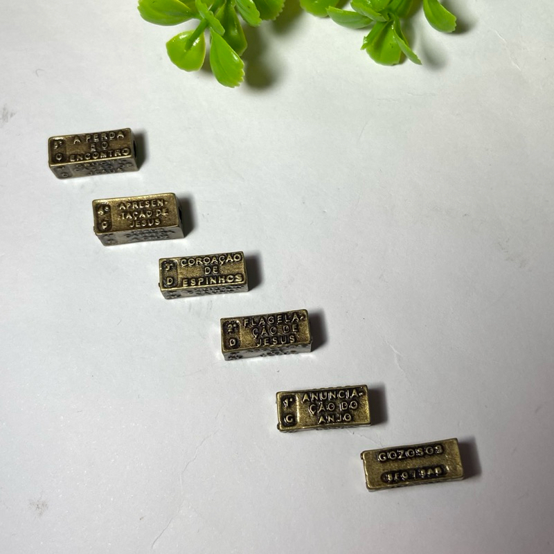 Kit para Pai Nosso - Passante Mistérios Produto com excelente acabamento para compor seu terço católico. Nele contém todas as contemplações dos mistérios escritos. **Kit para 1 terço** Contém 6 passantes para o Pai Nosso Cada um com um Mistério diferente Medidas: - Altura: 0.7 mm - Largura: 1.7 cm Banho: Ouro Velho