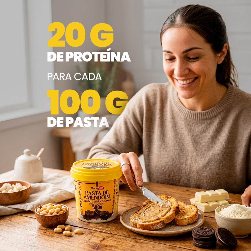 Manicrem é incomparável, além de qualidade dos ingredientes, sua textura cremosa e seu sabor proporcionam maior prazer na hora de comer. Se você ainda não conhece a Manicrem Leitinho Cookies e Cream com Whey Protein, experimente e surpreenda-se. PASTA DE AMENDOIM Linha MANICREM Delicioso sabor de Leitinho Cookies e Cream Pote de 500g INGREDIENTES: - Amendoim - Leite em pó - Chocolate Branco Zero Açúcar - Cookies - Whey Protein - Aroma e saborizante de Chocolate Branco - Adoçante Stevia * Amendoim Selecionado * Zero Açúcar * Alto Valor Energético * Zero Gordura Trans * Zero Conservantes * 20g Proteína ALÉRGICOS: Contém Leite; Contém Amendoim; Contém derivados de Trigo, Leite, Cevada e Soja; Pode Conter Centeio, Aveia, Avelã, Castanha de Caju, Castanha do Pará, Amêndoa, Macadâmia, Nozes e Pistache.