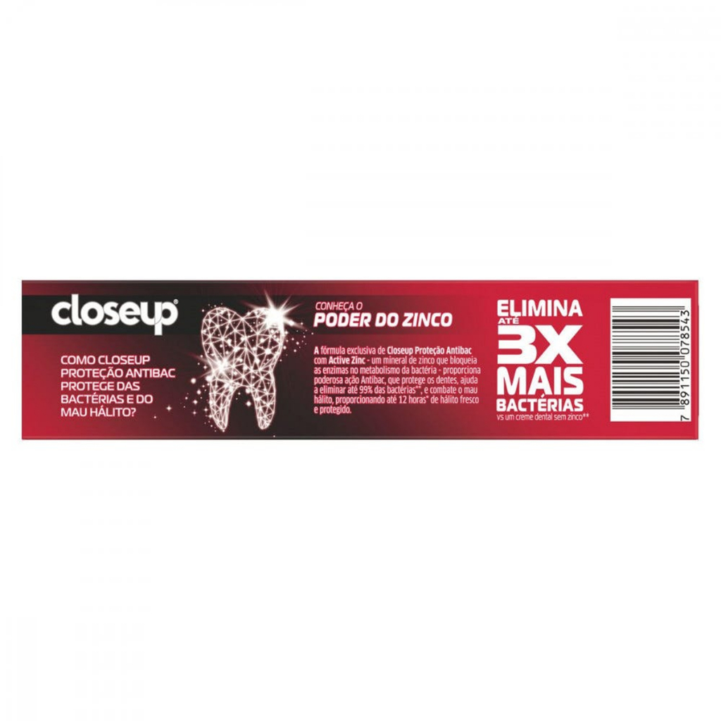 Pasta de Dentes Closeup Poder Antibac Menta Intensa em Gel 85g A Pasta de Dentes Closeup Poder Antibac Menta Intensa em Gel oferece uma escovação potente com proteção antibacteriana e um frescor duradouro. Sua fórmula inovadora com microcristais e ação antisséptica combate 99% das bactérias causadoras do mau hálito, ao mesmo tempo em que proporciona uma sensação de limpeza intensa e refrescante. Principais Características: • Tecnologia Antibac com ação antisséptica – Elimina até 99% das bactérias causadoras do mau hálito e protege por horas. • Fórmula em gel com menta intensa – Garante uma explosão de frescor a cada escovação. • Cristais de frescor ativos – Atuam na limpeza profunda dos dentes, promovendo sensação de higiene prolongada. Benefícios: - Hálito fresco por até 12 horas - Combate eficaz contra bactérias bucais - Sensação imediata de limpeza profunda - Ajuda a prevenir cáries e placa bacteriana - Textura em gel que proporciona uma escovação mais suave e eficaz Diferenciais do Produto: - Tecnologia antibacteriana de alta performance - Sabor de menta intensa para uma experiência revitalizante - Embalagem prática para o dia a dia - Indicado para quem busca proteção completa com sensação de frescor duradouro Especificações Técnicas: - Peso: 85g Instruções de Uso: - Escove os dentes ao menos três vezes ao dia, após as refeições ou conforme orientação do seu dentista. Utilize também fio dental e enxaguante bucal para uma higiene bucal completa. Avisos e Precauções: - Uso externo. - Não ingerir. - Mantenha fora do alcance de crianças menores de 6 anos. - Em caso de ingestão acidental em grande quantidade, procure orientação médica. O que está incluso? - 1 Pasta de Dentes Closeup Poder Antibac Menta Intensa em Gel 85g ---- DÚVIDAS FREQUENTES ---- Os produtos são originais? Sim. Todos os nossos produtos são originais. Emitem nota fiscal? Sim. Emitimos nota fiscal para todos os pedidos.