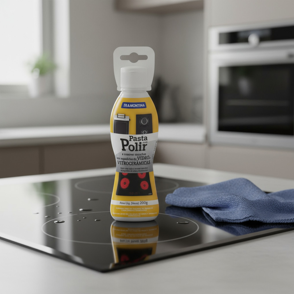 Pasta para Polimento e Remoção de Manchas em Vidro e Vitrocerâmicas Tramontina – 200 g A Pasta Tramontina para Vidro e Vitrocerâmicas foi desenvolvida especialmente para restaurar o brilho e a aparência das superfícies de vidro. Com sua fórmula eficaz, remove manchas causadas por água e gordura, deixando um acabamento limpo, brilhante e espelhado. Ideal para uso em janelas, boxes de banheiro, cooktops, tampas de vidro e demais superfícies vitrificadas, garantindo resultado visível já nas primeiras aplicações. Dimensões do Produto (C x L x A): 3 x 6 x 19 cm Modo de Uso Certifique-se de que a superfície esteja limpa e seca. Aplique uma pequena quantidade da pasta diretamente na área desejada. Com uma flanela de algodão limpa e seca, esfregue de maneira uniforme. Continue o polimento até que se forme um resíduo escuro (indicando remoção das impurezas). Retire o excesso lavando com detergente e enxágue normalmente ou finalize com um pano seco. Produto não tóxico e não inflamável. Notificado na Anvisa – Autorização MS: 3.02769-6. Informações Técnicas Tipo: Pasta Peso: 200 g Indicação: Vidro e Vitrocerâmicas Polimento: Sim Remove manchas: Sim Proporciona brilho: Sim