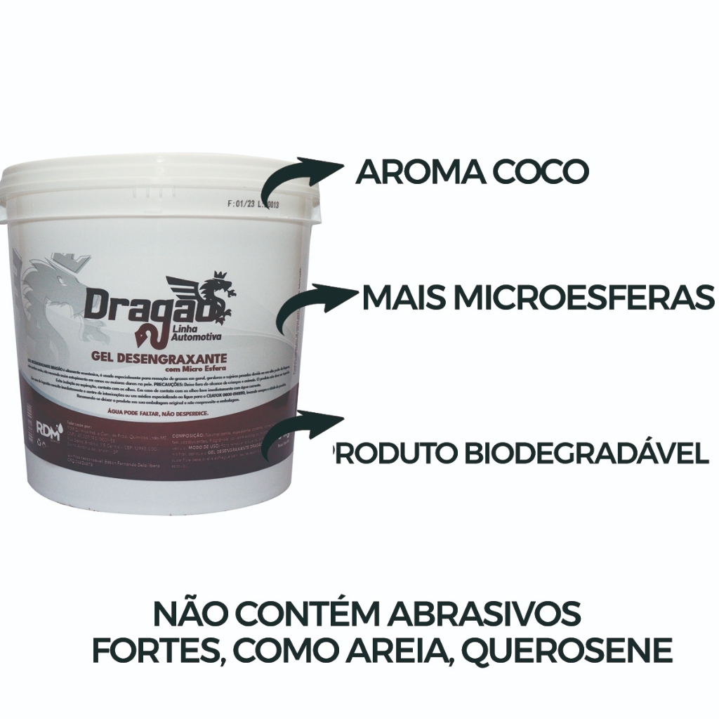 Gel Desengraxante Dragão Branco é um produto inovador para limpeza de superfícies e das mãos de profissionais que trabalham em atividades que envolvam a aplicação ou limpeza de graxa como serviços de manutenção e mecânicos em geral. É altamente econômico indicado especialmente para remoção de graxas em geral, gorduras e sujeiras pesadas. Trata-se de uma composição especial onde não são usados produtos abrasivos como querosene, areia, pó de mármore, etc. PRODUTO DE EXCELENTE QUALIDADE!!! PRODUTO 100% NACIONAL Tem alguma dúvida sobre nosso Gel Desengraxante Dragão Branco? Entre em contato conosco e teremos prazer em ajudar! MODO DE USAR: Para remover a sujeira, antes de molhar, aplique o gel sobre a superfície desejável e esfregue bem. Remova a sujeira com água corrente ou pano seco. APLICAÇÃO: Desenvolvida para limpeza e remoção de graxas e sujeiras pesadas. Recomendável o uso em mecânicas, metalúrgicas, gráficas, comércios, indústria entre outros. COMPOSIÇÃO: Neutralizante, espessante, corante, conservantes, coadjuvantes, fragrância, solvente ecológico, microesferas e veículo.