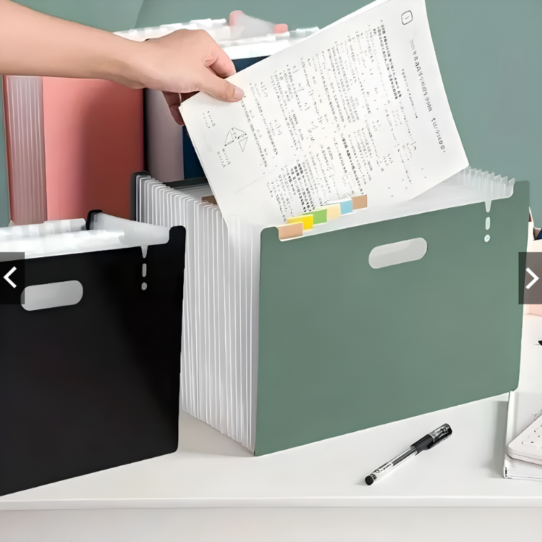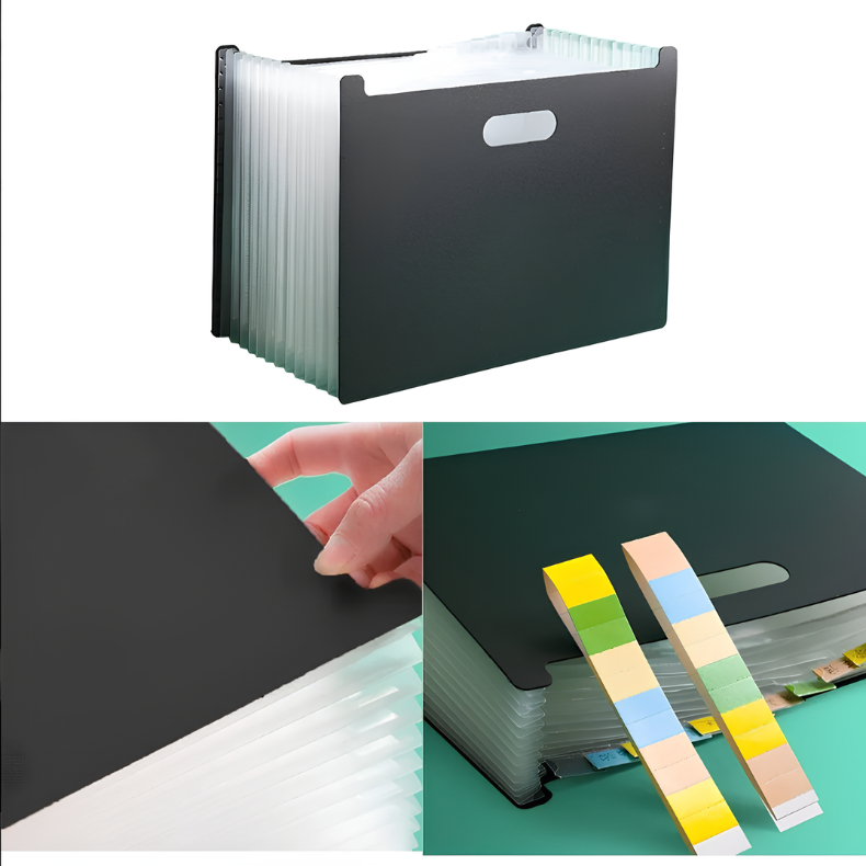 Pasta Organizadora A4 Expansível com 12 Divisórias – Impermeável e Portátil Descrição Organize seus documentos de forma prática, elegante e eficiente com esta pasta organizadora A4. Com design moderno e funcional, ela possui 12 divisórias internas que facilitam a separação e o acesso rápido a arquivos como contratos, comprovantes, provas e papéis diversos. Características do Produto Tamanho: 32,6 cm x 25,3 cm Peso aproximado: 300 g Material: Plástico reforçado, flexível e resistente Cor externa: Preta fosca Cor interna: Divisórias translúcidas Capacidade: 12 compartimentos expansíveis Identificação: Etiquetas coloridas inclusas para nomear cada seção Impermeável e resistente à poeira Vantagens do Produto Estrutura expansível, ideal para uso sobre a mesa ou transporte Alça embutida que facilita o manuseio Mantém os documentos protegidos, organizados e visíveis Informações para envio (com embalagem) Uso ideal Excelente para escritórios, uso escolar ou organização pessoal