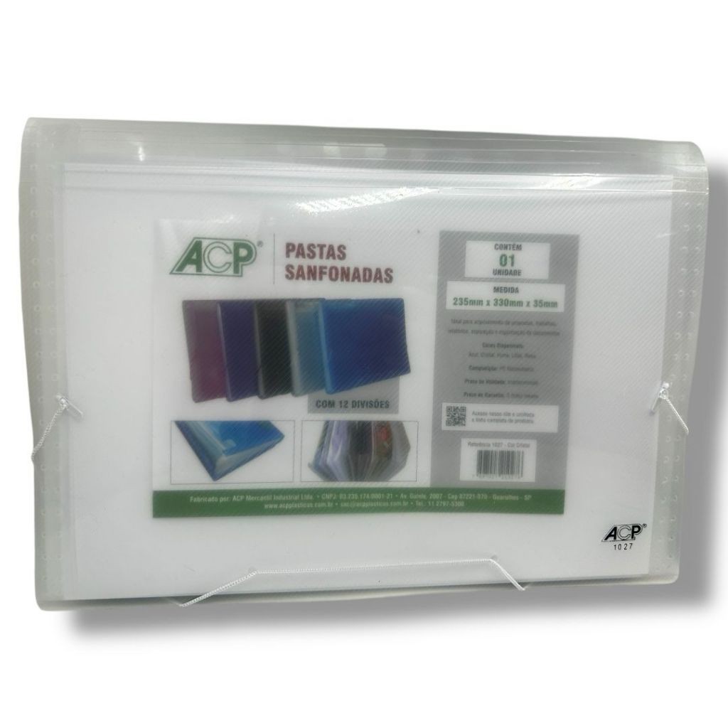 Pasta Sanfonada Plastica A4 12 Divisões, Cristal - ACP / DAC A Pasta Sanfonada da ACP é perfeita para organizar documentos, como contas a pagar, cheques e papéis financeiros, além de ser uma excelente opção para separar materiais, provas e outros materiais escolares ou profissionais. MAPU Distribuidora de Materias, no mercado desde 1989, trazendo a melhor experiência de compras para nossos clientes.